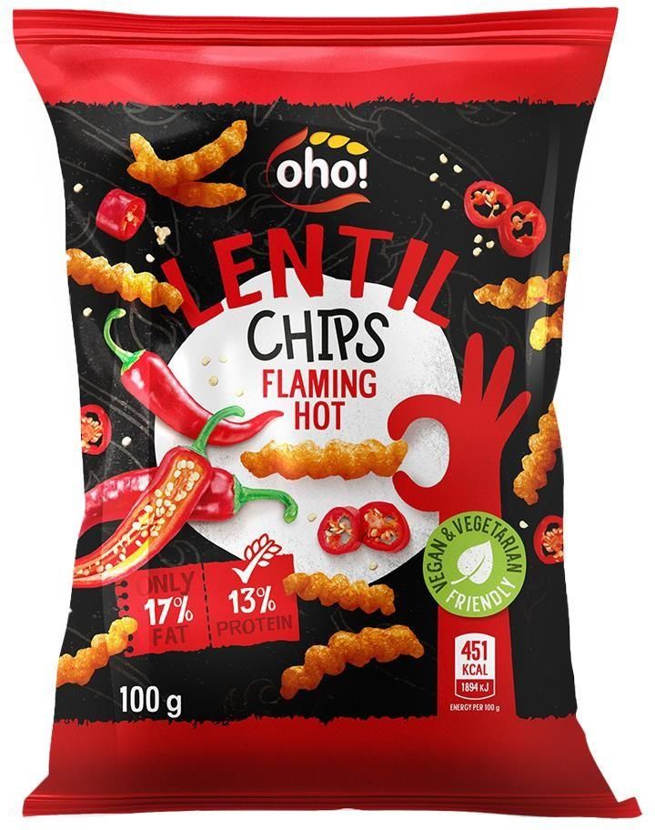 CHIPSY Chrupki z Czerwonej Soczewicy o Smaku FLAMING HOT 100g Oho! Chipsy z soczewicy o ognistym smaku Flaming Hot marki Oho to świeża propozycja w świecie zdrowych przekąsek. Chrupki Oho zachwycają innowacyjną recepturą, prostym składem i intensywnym, pikantnym profilem smakowym. Mają aż 13% białka i tylko 19% tłuszczu, czyli wyraźnie mniej niż klasyczne chipsy ziemniaczane. Co ważne, produkty Oho nie zawierają oleju palmowego ani glutaminianu sodu. Unikalna mieszanka ostrych przypraw sprawia, że trudno się od nich oderwać. Przekąska odpowiednia dla wegan i wegetarian. Składniki mąka z czerwonej soczewicy (42%), mąka kukurydziana, olej rzepakowy, mąka ryżowa, mieszanka przypraw (cukier, dekstroza, sól, przyprawy, cebula, pomidor, ekstrakt przypraw, ekstrakt drożdżowy, sok cytrynowy granulowany, czosnek, ekstrakt ziołowy), sól. Wartości odżywcze: W 100 g/ml: Wartość energetyczna 451/1894 Kcal/Kj, Tłuszcz 17 g, w tym kwasy tłuszczowe nasycone 1.4 g, Węglowodany 59 g, w tym cukry 8.3 g, Białko 13 g, Sól 3.3 g, Błonnik 5.6 g. Przechowywać w suchym i chłodnym miejscu, chronić przed bezpośrednim działaniem promieni słonecznych.