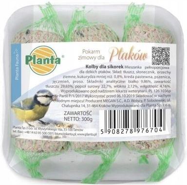Planta kolby z karmą 3 szt. 300g zimowe dla ptaków dzikich ogród Zestaw3 kolb zimowych Planta 300 g to idealne rozwiązanie do dokarmiania dzikich ptaków przez całą zimę. Każda kolba zawiera starannie dobraną mieszankę nasion oleistych, zbóż i orzechów zatopionych w tłuszczu – to wysokoenergetyczny pokarm wspierający przeżycie ptaków w niskich temperaturach. Najważniejsze cechy i korzyści Zestaw 3 sztuk – każda kolba to ok. 100 g zawartości (łącznie 300 g) Mieszanka pełnoporcjowa – składniki: słonecznik, orzechy ziemne, kukurydza, pszenica, jęczmień, proso oraz tłuszcze Kolby w siatce – łatwe do zawieszenia w ogrodzie, na drzewach, karmnikach, altanach Zimowa formuła – utrzymują strukturalną spójność w mroźne dni, nie topią się od razu Uniwersalne zastosowanie – przystosowane dla wielu gatunków ptaków: sikorek, zięb, kowalików i innych zimujących Bezpieczne wykonanie – produkowany zgodnie ze standardami weterynaryjnymi, pakowany tak, by chronić przed wilgocią Dlaczego warto? Dzięki zestawowi 3 kolb masz zapas pokarmu na dłuższy czas, nie musisz dokupywać jednostkowo. Mieszanka pełnoporcjowa dostarcza ptakom niezbędne składniki odżywcze i energię w trudnych warunkach zimowych. Forma kolbowa z tłuszczem sprzyja korzystaniu przez wiele gatunków ptaków, które chętnie „skubią” kolbę w siatce.