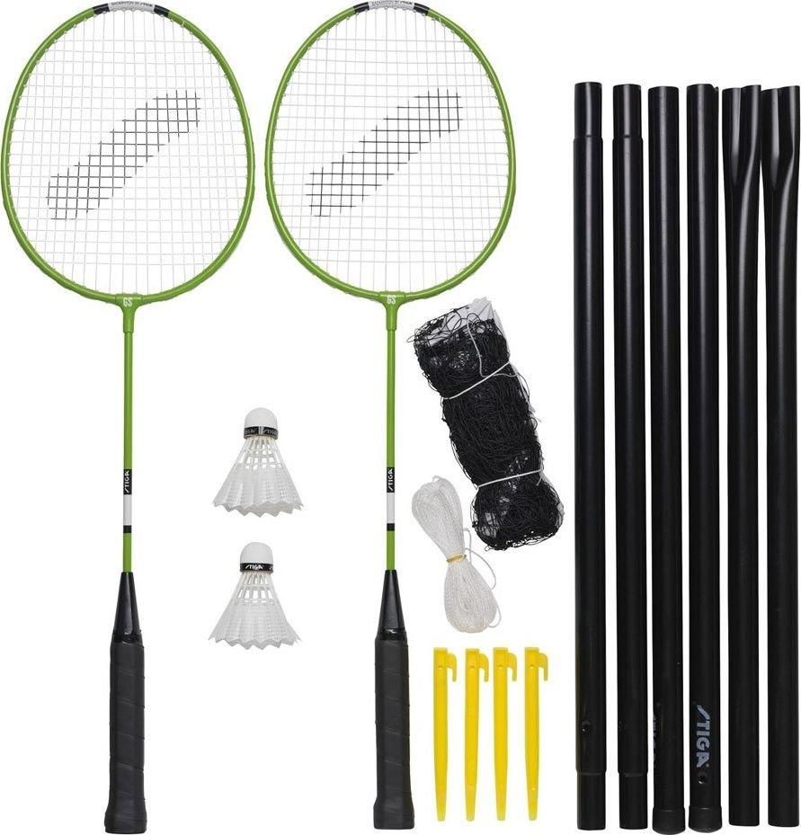 Zestaw do Badmintona Stiga Garden GS Set 2 rakiety 2 lotki siatka ze słupkami Zestaw do badmintona Stiga Garden GS Set idealny do zabawy w ogrodzie. Zestaw zawiera dwie rakietki senior, dwie lotki, stelaż ze stalowych słupków, siatkę, śledzie, naciąg i pokrowiec. Całość zapakowana w trwałe i przenośne opakowanie zapinane na zamek. Rakietki w kolorze zielonym z czarno-białymi detalami i białymi lotkami. Pokrowiec z jednej strony przeźroczysty a z drugiej w kolorze czarnym z białym logo.