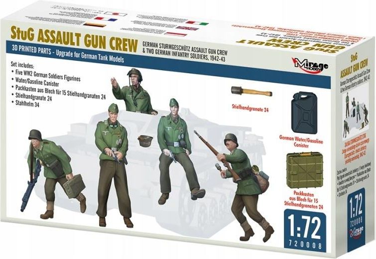 1:72 StuG Assault Gun Crew And Two Infantry Soldiers 1942-43 - MIRAGE 720008 German Sturmgeschutz Assault Gun Crew And Two German Infantry Soldiers 1942-43 Model został przygotowany w technice druku 3D wysokiej jakości. Zestaw zawiera Pięć figurek niemieckich żołnierzy z okresu II wojny światowej Kanister na wodę/benzynę Blaszane opakowanie na 15 granatów ręcznych 24 Granat ręczny 24 Hełm stalowy 34 Symbol produktu: MIR-720008 Producent: Mirage Hobby