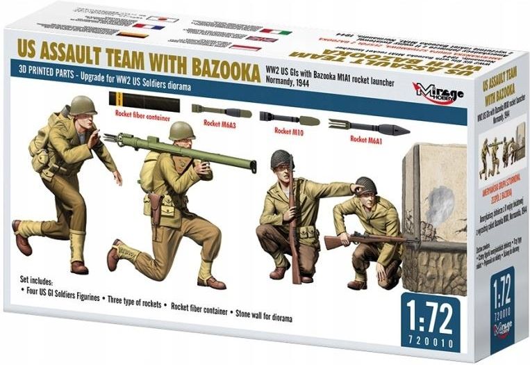 Mirage 720010 - 1:72 Amerykańska grupa szturmowa, zespół z Bazooka MIRAGE 720010 1:72 US ASSAULT TEAM WITH BAZOOKA WW2 US GIs with Bazooka M1A1 rocket launcher Normandy, 1944 The model was fully developed in the technology of high-quality 3D printing. Set includes: Four US GI soldiers Figurines, …