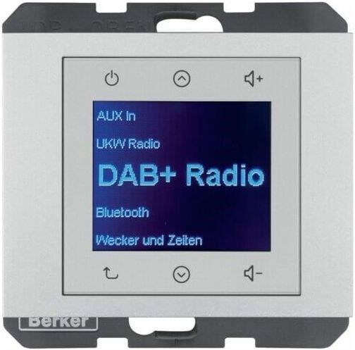 Radio DAB+, w kolorze Aluminium, z serii K.5, o numerze katalogowym 29847003, producenta Berker by Hager. Radioodbiornik odbiera stacje radiowe UKF i DAB, dodatkowo odtwarza sygnały audio z wejścia AUX przez podłączone głośniki. Do kompletu wymagany głośnik i ramka z wybranej serii. Pojemnościowy wyświetlacz dotykowy Ręczne i automatyczne wyszukiwanie radiostacji Pamięć 8 stacji UKF i 8 stacji DAB Wyświetlanie odbieranej częstotliwości i informacji RDS Wyświetlanie godziny i daty w trybie standby Automatyczne ustawianie godziny i daty podczas odbierania sygnału RDS Funkcja budzenia przez włączenie radiostacji lub sygnału akustycznego Timer (odliczanie) z sygnałem akustycznym po upływie ustawionego czasu (także podczas odbioru audycji radiowej) Tryb uśpienia z funkcją automatycznego wyłączania Można aktywować tryb hotelowy z ograniczeniami funkcjonalnymi 10 poziomów i 8 nastaw czasowych regulacji z możliwością odwrócenia kolorów Przyłącze rozszerzenia np. łącznika, czujnika AUX-IN do podłączania zewnętrznych źródeł audio, np. smartfona lub odtwarzacza MP3 do gniazda multimedialnego