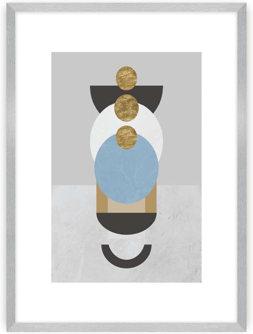 Oryginalny plakat z geometrycznymi kształtami, w odcieniach czerni, błękitu, szarości i złotego na szarym tle. Plakat został oprawiony w białą, wbudowaną ramę z passe partout.Grafika wydrukowana została na papierze satynowym bez połysku o gramaturze 200g. Plakat można kupić bez ramki, jednak dla uzyskania lepszego efektu dobierz pasującą ramkę. Pozwoli Ci to na stworzenie kompletnej galerii na ścianie. W naszej ofercie posiadamy ramki w kolorze: białym, czarnym, srebrnym i złotym.Ramki dostępne są w pięciu rozmiarach. Rozmiary 21x30cm, 30x40cm, 40x50cm wykonane są z tworzywa sztucznego. Rozmiary 50x70cm i 70x100cm wykonane są z aluminium.