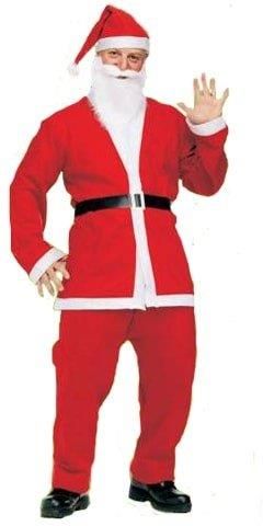 Kostium Świętego Mikołaja Strój składa się z czapki, brody z wąsami, bluzy, paska i spodni. Czapka obwód 59cm, długość 44cm. Broda z wąsami na gumce, długość 22cm. Bluza obwód do 140cm. Pasek 135cm długości. Spodnie ściągane w pasie sznurkiem obwód pasa 110cm,długość nogawki mierzona od pasa w dół do 140cm. Strój pakowany z woreczek z wieszakiem, w środku tekturka ze zdjęciem i opisem.