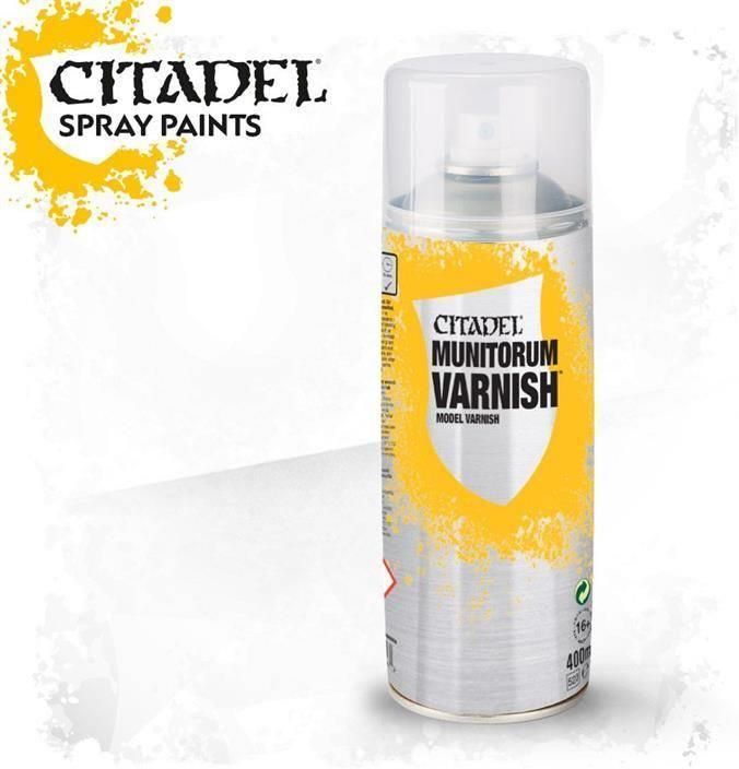 Citadel Munitorum Varnish Spray Citadel Munitorum Varnish Spray to ochronny lakier w sprayu, stworzony specjalnie z myślą o zabezpieczaniu pomalowanych figurek przed uszkodzeniami mechanicznymi i ścieraniem. Tworzy trwałą powłokę, która utrwala farby i zwiększa odporność modeli na czynniki zewnętrzne, nie wpływając przy tym na detale czy kolory. Produkt dostępny jest w wygodnej puszce o pojemności 400 ml, co pozwala na szybką i równomierną aplikację na wielu modelach. Idealny dla modelarzy, którzy chcą zachować efekty malarskie w nienaruszonym stanie na długi czas.