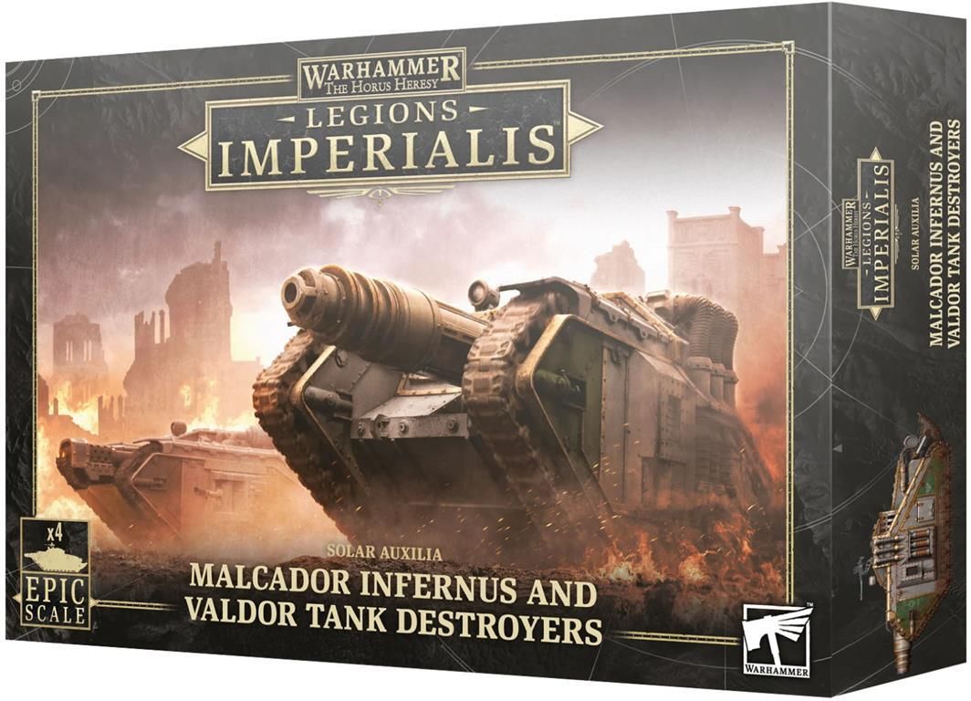 Produkt nowy, oryginalny i fabrycznie zapakowany. Do samodzielnego złożenia i pomalowania. Nie zawiera farb ani kleju. -------------------------------------------------------------------------------------- Opis producenta: The Malcador Infernus and Valdor Tank Hunter are both variants of the ubiquitous Malcador tank, using its resilient and mobile chassis to carry specialised heavy weaponry. The raw power of the Malcador Infernus is almost inescapable for its foes, as it shoots terrifying jets of all-consuming flame for extended periods. Conversely, the Valdor Tank Hunter focuses on hardened targets, living up to its name by unleashing its neutron beam laser on armoured vehicles to devastating effect. This multipart plastic kit builds four epic scale Solar Auxilia heavy tanks, built around the formidable Malcador chassis – two Malcador Infernus flame tanks, and two Valdor Tank Hunters. The Malcador Infernus is mounted with an inferno gun for burning infantry out of dense cover, and trailed by a separate fuel tanker, while the Valdor Tank Hunter is armed with a powerful neutron beam laser. Each of these heavy tanks can be built with or without a tank commander, and comes with a choice of paired autocannon or lascannon sponsons. The set includes: – 2x Solar Auxilia Malcador Infernus Tanks, each with the following weapon options: – 2x sponson-mounted autocannons – 2x sponson-mounted lascannons - 2x Solar Auxilia Valdor Tank Hunters, each with the following weapon options: – 2x sponson-mounted autocannons – 2x sponson-mounted lascannons – 1x Solar Auxilia Vehicle Transfer Sheet This kit comprises 124 plastic components and a transfer sheet. These miniatures are supplied unpainted and require assembly – we recommend using Citadel Plastic Glue and Citadel Colour paints. Rules for using Malcador Infernus Tanks and Valdor Tank Hunters can be found in Warhammer: The Horus Heresy Legions Imperialis – The Great Slaughter, and a copy of Warhammer: The Horus Heresy – Legions Imperialis Rulebook is required to use these miniatures. Both of these books are available separately. -------------------------------------------------------------------------------------- Więcej zdjęć i szczegółów dostępnych jest na stronie producenta