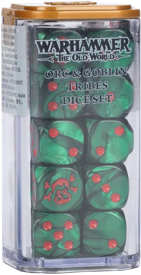 Zestaw zawiera 20 kości z motywem frakcji Orc and Goblin Tribes. Są odlane w kolorze ciemnozielonym, z czerwonymi oznaczeniami. Kości K6 z dumą mają ikonę frakcji Orc and Goblin Tribes na ściance „6” każdej kości. Zawiera 20 kostek o wymiarach 16 mm x 16 mm x 16 mm: – 18x kości K6 – 1x Artillery dice (labelled 2, 4, 6, 8, 10, Misfire) – 1x Scatter dice Produkt znajduje się w przedsprzedaży do 6 Kwietnia!