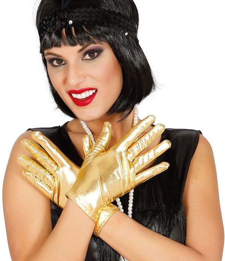 Rękawiczki krótkie 22cm - złote Rękawiczki o długości za nadgarstek w kolorze złotym - połyskującym to idealny dodatek do kostiumu Glamour Girl, damy z lat 20-tych, pięknej anielicy czy robota. Rękawiczki wykonane z cienkiego materiału, elastyczne. Rozmiar uniwersalny - dla dorosłych, pasuje zarówno dla kobiet jak i mężczyzn. Wymiary: Długość całkowita: 22 cm Długość środkowego palca:8 cm Szerokość nadgarstka:8,5 - 12,5 cm Szerokość dłoni: 8,5- 11,5 cm