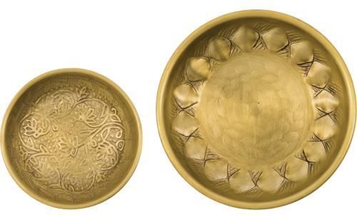 Miska, HDUna, Złota. Dodaj ciepła i wyrafinowania do swojego domu dzięki temu zestawowi dwóch ręcznie robionych złotych misek. Wykonane z aluminium, te elementy dekoracyjne charakteryzują się oszałamiającym wytłoczonym wzorem i antycznym wykończeniem. Idealne do przechowywania małych świec lub biżuterii, te misy oferują nieskończone możliwości stylizacji.- Ręcznie wykonane dla wyjątkowego uroku - Wykończenie w kolorze starego złota - Tłoczone wzory - Wszechstronne zastosowanie dekoracyjne Użyj tych wykwintnych mis, aby subtelnie i elegancko odświeżyć wystrój swojego wnętrza. Rozmiar: wys.: 2,5 cm, gł.: 11 cm wys.: 3 cm, gł.: 16 cm W zestawi są 2 miseczki Materiał: Główny: Aluminium (100%) Ogólne cechy: Ręcznie robione Może się różnić: Wykończenie, Kolor, Rozmiar Masa netto: 0,09 kg Ogólne czyszczenie: Czyścić suchą szmatką