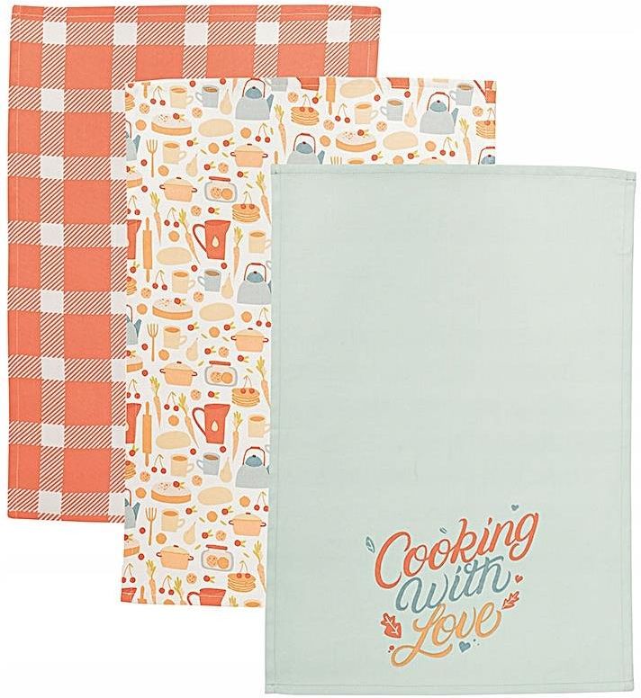 COOKING WITH LOVE – komplet 3 jesiennych ścierek kuchennych 40×60 cm COOKING WITH LOVE – komplet 3 jesiennych ścierek kuchennych 40×60 cm Wprowadź do swojej kuchni przytulną, jesienną atmosferę dzięki zestawowi ścierek kuchennych COOKING WITH LOVE. Ciepła kolorystyka, urocze motywy inspirowane gotowaniem i klimatem domowego ogniska sprawiają, że zestaw doskonale podkreśli charakter wnętrza w chłodniejsze dni. To nie tylko praktyczne akcesoria, ale również piękna dekoracja kuchni. Dlaczego warto wybrać komplet COOKING WITH LOVE? Jesienny charakter – przytulne wzory i barwy w odcieniach pomarańczu, beżu i mięty wprowadzają klimat ciepła i domowej atmosfery 100% naturalna bawełna – gwarancja doskonałej chłonności i wytrzymałości Uniwersalny rozmiar 40×60 cm – wygodne do codziennego użytku Gramatura 190 g/m² – solidny i trwały materiał, odporny na zużycie Nowoczesne nadruki – modne wzory, które odświeżą wygląd kuchni Łatwe w czyszczeniu – można prać w pralce, zachowując kolory i jakość Zastosowanie ścierek kuchennych Ściereczki świetnie sprawdzą się do wycierania naczyń, polerowania szkła, osuszania owoców czy sprzątania powierzchni kuchennych. Dzięki pięknym, jesiennym motywom mogą pełnić również funkcję dekoracyjną, dodając wnętrzu ciepła i uroku. Komplet ścierek COOKING WITH LOVE to praktyczne i stylowe uzupełnienie kuchni. Świetnie sprawdzi się zarówno na co dzień, jak i jako drobny, funkcjonalny prezent dla miłośników gotowania i jesiennej atmosfery. DANE TECHNICZNE Wymiary: 40 × 60 cm Materiał: 100% bawełna Gramatura: 190 g/m² Kolorystyka: odcienie pomarańczu, mięty, beżu – idealne na jesień Liczba sztuk w zestawie: 3 Tolerancja wymiarów: ±2% Pranie: możliwość prania w pralce zgodnie z instrukcją na metce