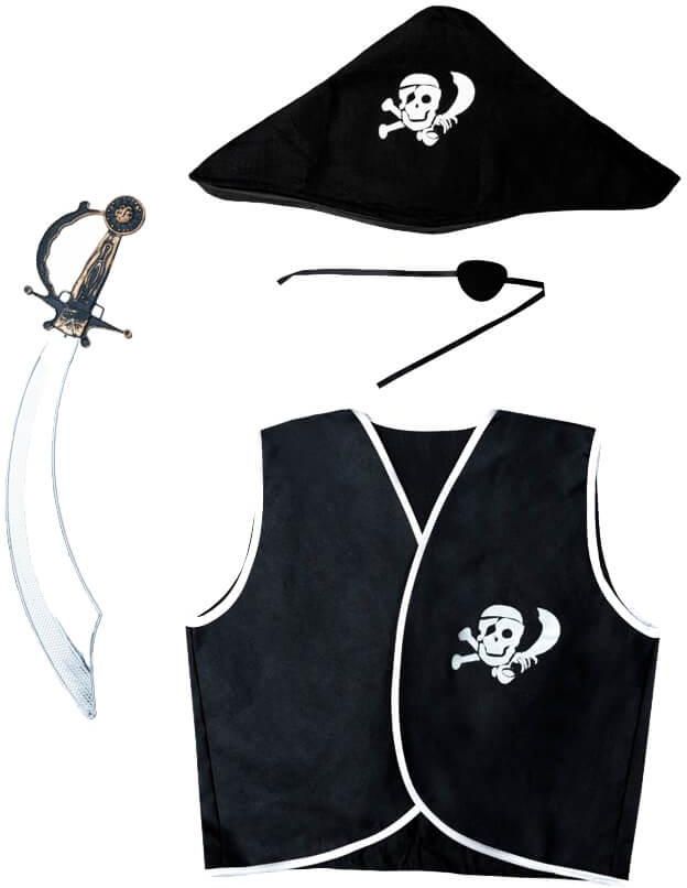 ZESTAW MAŁY PIRAT Zestaw zawiera: kamizelkę, czapkę, szablę, opaskę na oko. Kamizelka bez rękawków, wykonana ze sztywnego materiału w kolorze czarnym. Wykończona białą lamówką, z przodu nadruk białej czaszki. Nie zapinana. Szerokość kamizelki - ok. 80 cm Długość - ok. 38 cm Czapka w stylu pirackim, …