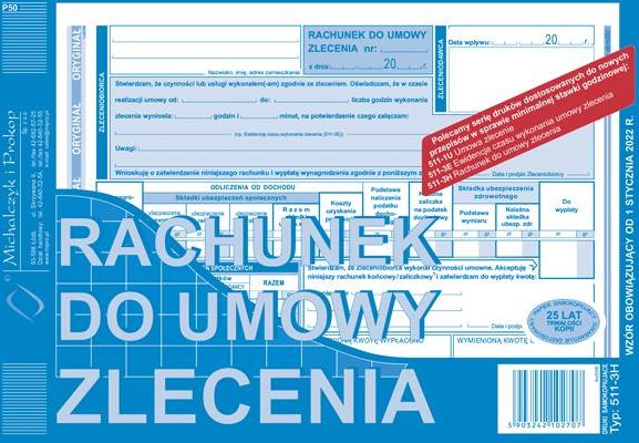 511-3H RACHUNEK DO UMOWY ZLECENIA * format: A5 * rodzaj papieru: samokopiujący * zastosowanie: druki kadrowe * oprawa: bloczek 40 kartek * druk: jednostronny (oryginał + kopia)