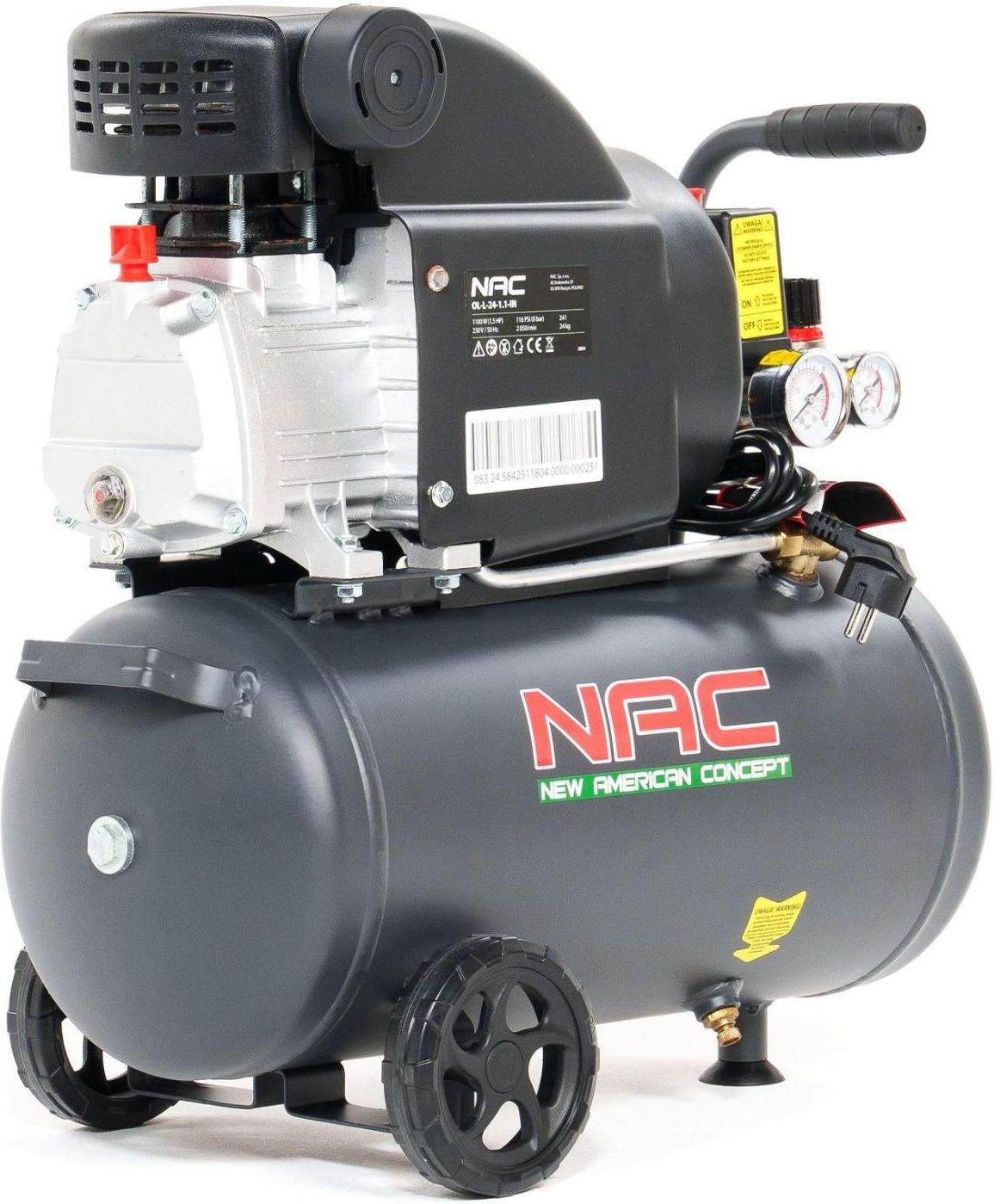 Kompresor olejowy NAC OL-L-24-1.1-IN o mocy silnika 1100 W. Maksymalne ciśnienie urządzenia 8 bar a wydajność 158 l/min.