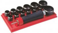 Zestaw wycinaków rymarskich firmy NAREX - 13szt z wymienną rękojeścią. Zestaw zawiera wymienne wycinaki o średnicach: 10, 12, 14, 16, 18, 20, 22, 25, 30, 35, 40, 45, 50 mm i rękojeść do pobijania. Wycinaki wykonane są ze stali chromowo-wanadowej hartowanej do uzyskania twardości 52HRc. Przeznaczone do wycinania uszczelek z gumy, korka i innych materiałów miękkich oraz wycinania otworów w tych materiałach.