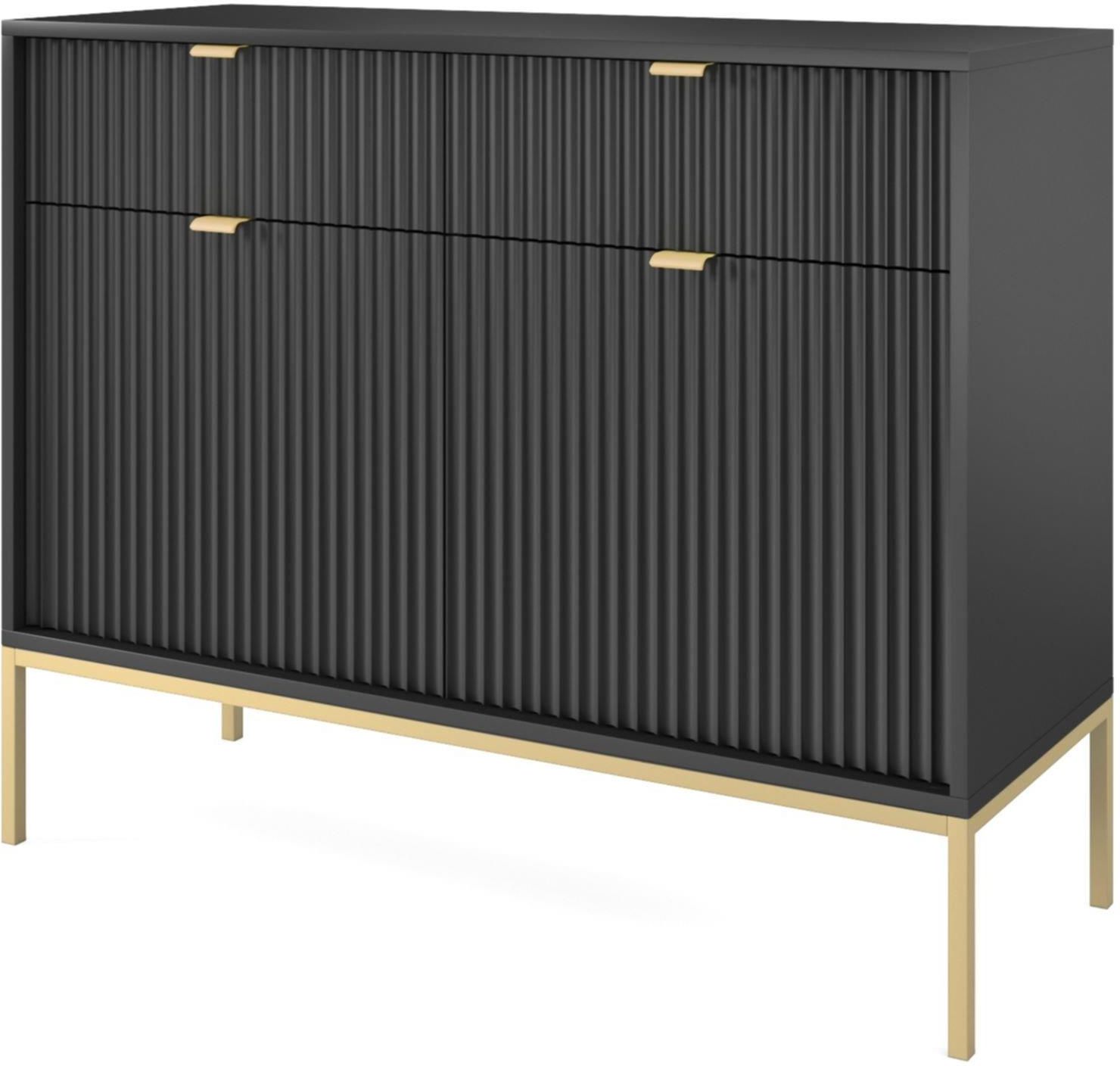 Komoda z szufladami to mebel fantastycznie wielofunkcyjny. Wkomponowana w salonową przestrzeń może posłużyć jako schowek na dokumenty i podręczne akcesoria, w sypialni wcieli się w rolę szafki na ubrania i bieliźniarki, z kolei w kuchni, sprawdzi się jako pojemna spiżarnia lub barek. Komoda dwudrzwiowa z szufladami z kolekcji NOVA to zatem model uniwersalny, który cieszy nie tylko ergonomicznymi rozwiązaniami, ale również ciekawym, minimalistycznym designem. Modne, ryflowane drzwi i oszczędne wzornictwo idealnie odnajdą się w przestrzeniach w stylu loftowym, nowoczesnym czy vintage. Całości charakteru dodają złote uchwyty oraz industrialny stelaż dostępny zarówno w kolorze czarnym, jak i złotym. Sam mebel można dostać w wariantach: białym, czarnym oraz szarym. Na koneserów modnych wnętrz o przemyślanej, spójnej aranżacji, czekają również inne modele mebli z kolekcji NOVA.