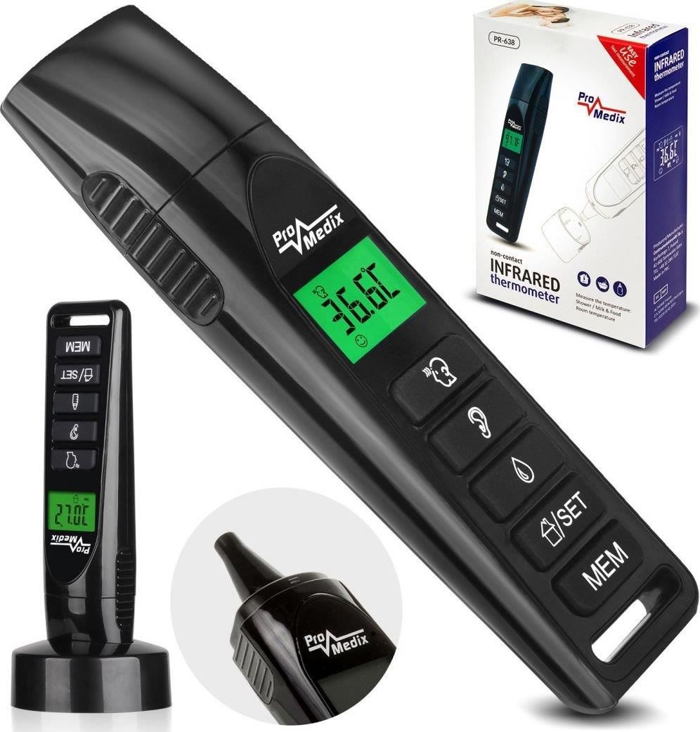BEZDOTYKOWY ELEKTRONICZNY TERMOMETR NA PODCZERWIEŃ Promedix PR-638 (70028) Dokładny i szybki: błąd pomiaru na poziomie +/-0,2°C oraz prędkość pomiaru ok. 1 sekunda Szeroki zakres pomiaru temperatur: 0-100°C Wyświetlacz LCD z zielonym podświetleniem Tryb oszczędzania energii – termometr przechodzi w stan czuwania po ok. 15 sekundach Ustawianie daty i godziny Termometr zapisuje ostatnie 60 pomiarów Wiele zastosowań: pomiar temperatury czoła, w uchu, otoczenia oraz obiektów Bezpieczny w użyciu: bezdotykowy pomiar w odległości 1-3 cm Łatwy w obsłudze PROMEDIX – DBAMY O TWOJE ZDROWIE ProMedix to najwyższej jakości produkty medyczne, zdobywające coraz większe uznanie wśród klientów w Polsce. Ciągle doskonalimy nasze produkty, kładąc ogromny nacisk na najwyższą jakość, wykorzystanie najnowszych technologii, obserwacje trendów oraz rozwiązań technicznych. Z produktami firmy ProMedix odpowiednio zadbasz o zdrowie, które jest w życiu najcenniejsze. Inhalatory, termometry, ciśnieniomierze – wszystko, czego potrzebujesz w jednym miejscu i na wyciągnięcie ręki. Zdobyta wiedza i wieloletnie doświadczenie pozwoliły nam na produkcję profesjonalnego sprzętu, który spełnia oczekiwania najbardziej wymagających klientów. Promedix PR-638 Certyfikowany, bezkontaktowy termometr, wykorzystujący do pomiaru technologię podczerwieni. Promedix PR-638 posiada świadectwo zgodności dla wyrobów medycznych). Dzięki zastosowaniu funkcji bezdotykowego mierzenia temperatury, dokonujemy bardzo łatwo i bezinwazyjnie pomiarów temperatury u dzieci. Uniwersalność Termometr umożliwia pomiary temperatury zarówno ciała jak i powierzchni różnych materiałów czy otoczenia w zakresie od 0°C do 100°C. Dzięki temu można sprawdzić również np. temperaturę mleka w butelce lub wody do kąpieli. Dokładny pomiar Wysokiej jakości czujnik na podczerwień dokonuje szybkich i precyzyjnych pomiarów. Wyniki są wyświetlane na dużym, czytelnym, podświetlanym wyświetlaczu LCD. Termometr zapisuje ostatnie 60 pomiarów temperatury ciała w uchu lub na czole. Bieżący pomiar pojawi się jako ostatni w pamięci. Specyfikacja techniczna: Wymiary: 153.8 × 62.4 × 62.4 mm (dł x szer x wys) Waga: około. 96 g (z podstawką) Materiał: Tworzywa sztuczne, metal Zasilanie: 2 bateria AAA Metoda pomiaru: bezkontaktowa pomiar, przy użyciu podczerwieni Czas oczekiwania na pomiar: około 1 sek. Odległość pomiaru: około 1 do 3 cm (pomiar obiektu ) Wyświetlacz: LCD z zielonym podświetleniem, Dane przedstawione w: °C (stopnie Celsjusza) lub °F Rozdzielczość: 0,1 °C/°F Funkcja pamięci: przechowywanie ostatnich 60 pomiarów temperatury Funkcja oszczędzania energii: Termometr automatycznie wyłączy się po około 15 sek. Temperatura ciała: Zakres pomiaru: 32.0- 43.0 °C; (89.6 - 109.4°F) Dokładność pomiaru: 35.0 - 42.0°C; ( 85.0-107.6°F) +/- 0.2 °C (+/- 0.4 °F ) Temperatura obiektów: Zakres pomiaru: 0.0°C - 100.0 °C; (32.0 °F - 212.0 °F) Dokładność pomiaru: + / - 1.0 °C ( + / - 2.0 °F) Temperatura pomieszczeń: Zakres pomiaru: 0 °C - 50.0 °C; (32.0 °F- 122.0°F ) Dokładność pomiaru: +/- 1.0 °C ( + / - 2.0 °F) Warunki użytkowania: 10.0 °C - 40.0°C, ≤85%RH 760 hPa - 1060 hPa Warunki przechowywania: 0°C - +50.0°C ,≤90%RH 700 hPa - 1060 hPa Zestaw zawiera: Termometr bezdotykowy medyczny lekarski na podczerwień Promedix PR-638 Komplet baterii Podstawka Oryginalne opakowanie kod produktu:70028 CE42TG