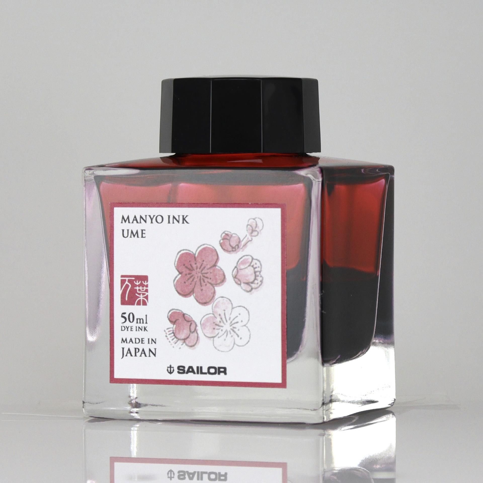 ATRAMENT SAILOR MANYO UME W szklanej buteleczce o pojemności 50 ml zamknięty jest doskonałej jakości japoński atrament marki Sailor. Atrament Ume ma intensywny czerwony kolor. Minimalistyczny kształt buteleczki ozdabia kolorowa etykieta, na której namalowana jest roślina będąca inspiracją dla nazwy i koloru atramentu. Tak jak wszystkie japońskie atramenty tak i atrament Sailor Manyo charakteryzuje się znakomitym przepływem i nasyceniem, brakiem strzępienia i bardzo dobrym cieniowaniem. Pisząc bardziej mokrą i grubszą stalówką atrament może lekko przebijać. Atrament ten nie jest wodoodporny.