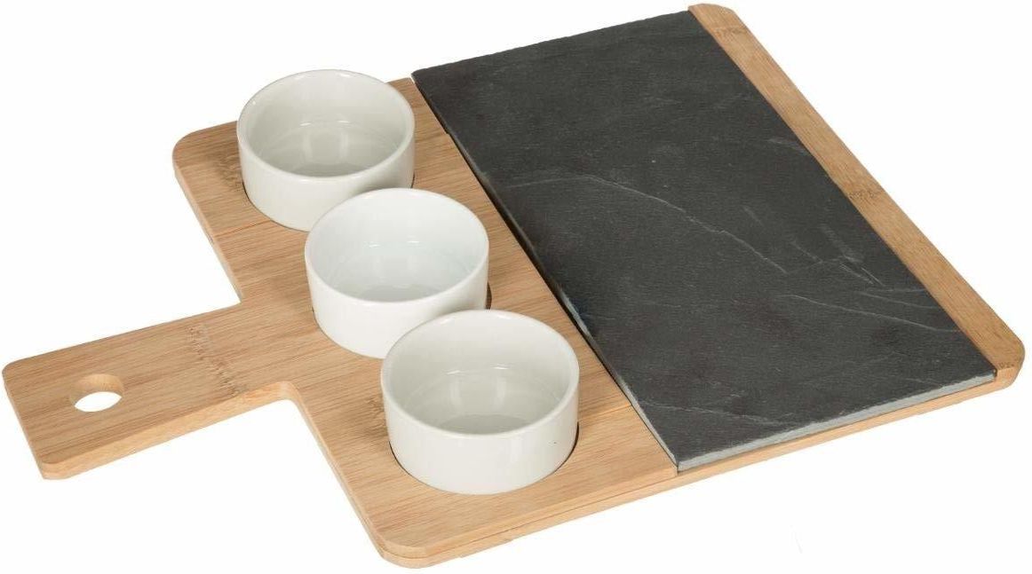 Zestaw do przekąsek z łupka i bambusa - nowoczesna elegancja w Twojej kuchni Prezentowany zestaw do przekąsek z łupka i bambusa od marki 5five simply smart to idealny wybór dla osób ceniących sobie elegancję i funkcjonalność. Wykonany z naturalnych materiałów - łupka i bambusa, zestaw jest nie tylko trwały, ale także bardzo stylowy. Deska bambusowa o wymiarach 35,6 cm x 25,8 cm i wysokości 1 cm to doskonałe miejsce na serwowanie różnorodnych przekąsek. Łupek o wymiarach 25,8 cm x 13 cm i wysokości 0,6 cm doskonale sprawdzi się jako podkładka pod gorące naczynia. Miska o średnicy 7 cm i wysokości 3,3 cm to idealne miejsce na sosy lub inne dodatki do przekąsek. Łupek i porcelana - materiały gwarantujące trwałość i bezpieczeństwo Zestaw do przekąsek został wykonany z wysokiej jakości materiałów, takich jak łupek, porcelana i bambus, które są nie tylko trwałe, ale także bezpieczne w kontakcie z żywnością. Łupek i porcelana są materiałami odporne na wysokie temperatury, dzięki czemu można je bez obaw używać w kuchence mikrofalowej. Bambus natomiast, ze względu na swoją naturalną strukturę, nie jest zalecany do mycia w zmywarce. Nowoczesny design i czarny kolor - idealne połączenie do każdej kuchni Design zestawu do przekąsek z łupka i bambusa jest bardzo nowoczesny, co sprawia, że będzie idealnie pasował do każdej, nawet najbardziej minimalistycznej kuchni. Czarny kolor łupka i porcelany doskonale kontrastuje z naturalnym kolorem bambusa, tworząc unikalną i elegancką kompozycję. Zestaw będzie doskonałym uzupełnieniem wyposażenia każdej kuchni i z pewnością podkreśli jej charakter. Co powinieneś wiedzieć przed zakupem Zestaw do przekąsek z łupka i bambusa to doskonałe połączenie elegancji i funkcjonalności. Wykonany z naturalnych materiałów - łupka, porcelana i bambus, które są trwałe i bezpieczne w kontakcie z żywnością. Można go bezpiecznie używać w kuchence mikrofalowej (z wyjątkiem deski bambusowej i łupka). Bambus nie jest zalecany do mycia w zmywarce. Nowoczesny design i czarny kolor sprawiają, że zestaw będzie idealnie pasował do każdej kuchni.