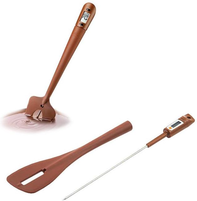 Thermo Choc firmy Silikomart to silikonowa szpatułka z termometrem do sprawdzania temperatury (od -40°C do 160°C/-40°F do 320°F) roztopionej czekolady, kremów, sosów, dżemów, syropów, po włosku bezy itp. Dane techniczne: 32 x 7 cm WAŻNE: silikonową szpatułkę można myć ręcznie lub w zmywarce. Sondę należy myć wyłącznie ręcznie. Nie nadaje się do użytku w kuchenkach mikrofalowych i piekarniku. Kod produktu:18/058