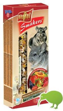 Smakers dla szynszyli Zawartość składników analitycznych: białko surowe 16 % (ozn. met. Kjeldahla), włókno surowe 11 %, oleje i tłuszcze surowe 7 %, popiół surowy 3,9 %. Zalecenia żywieniowe: Stosować codziennie Skład: produkty piekarnicze 20% owoce 26 % owoce oleiste 36 % ziarna zbóż 18 % Opakowanie: 2szt