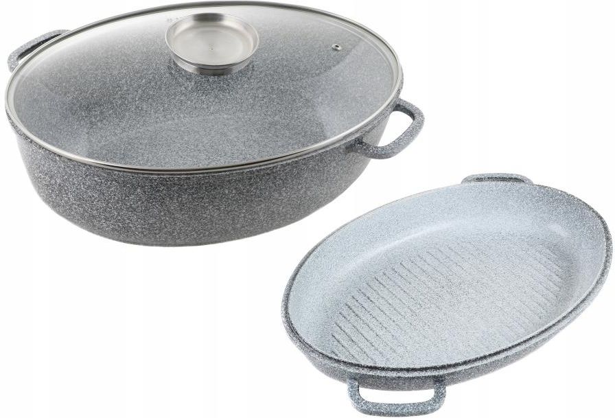 OPIS BRYTFANNA Z POWŁOKĄ MARMUROWĄ Wiele osób przyznaje się, że ma dość gotowania potraw w kilku oddzielnych naczyniach. Stałe mieszanie, próbowanie i kontrolowanie procesu gotowania oraz duża ilość brudnych garnków i pokrywek potrafi być wyjątkowo męczącym zajęciem. Jeżeli chcielibyście w końcu ułatwić sobie przyrządzanie smacznych i zdrowych potraw dla całej rodziny, koniecznie powinniście wypróbować brytfanny ceramiczno-marmurowej ZILNER ZL-1111. Brytfanna ceramiczno-marmurowa ZILNER ZL-1111 to wysokiej jakości naczynie, które pełni funkcję garnka i patelni. Niektórym osobom może kojarzyć się z typowo ,,świątecznym” naczyniem służącym np. do pieczenia indyka, kaczki lub gęsi. Jednak, jak się okazuje to niezwykle funkcjonalne, wytrzymałe i poręczne naczynie , z którego można korzystać każdego dnia. Umożliwia przygotowywanie soczystych i kruchych potraw, które zachowują swoje witaminy i wartości odżywcze. Doskonale nadaje się do pieczenia mięsa, drobiu, warzyw, zapiekanek, potraw jednogarnkowych, a nawet ciast i chleba. Brytfanna z powłoką marmurową ZILNER ZL-1111 pozwala przyrządzać potrawy zdrowe i smaczne – można używać ją bez dużych ilości tłuszczu. Posiada specjalną marmurową i nieprzywierającą powłokę, która zapobiega przypalaniu się jedzenia i dba o utrzymanie wartościowych składników w potrawie. Brytfanna owalna ceramiczno-marmurowa ZILNER ZL-1111 wykonana jest z trwałego stopu aluminium z powłoką marmurową, równomiernie i szybko rozprowadza ciepło i jest prosta w czyszczeniu – możliwość mycia w zmywarce. Sprawdza się na wszystkich rodzajach kuchenek - halogenowych, ceramicznych, gazowych oraz indukcyjnych, ponadto może być stosowana w piekarniku. Do brytfanny dołączona jest szklana pokrywa z dozownikiem, która jest odporna na bardzo wysokie temperatury. Pokrywa posiada specjalny stalowy uchwyt umożliwiający łatwe dosypywanie przypraw lub dolewanie olejów (AROMA KNOB) podczas gotowania, duszenia lub pieczenia potraw. Dodatkową zaletą pokrywy jest przezroczysta forma, która pozwala na swobodną kontrolę procesu przyrządzania posiłków. Brytfanna z powłoką marmurową ZILNER ZL-1111 zachwyca nie tylko wszechstronną funkcjonalnością, ale również swoim ekskluzywnym wyglądem. Marmurowa powłoka w modnych odcieniach szarości, nowoczesny owalny kształt oraz dbałość o wszelkie detale sprawia, że brytfanna jest prawdziwą ozdobą każdego wnętrza kuchennego. Pozwoli Tobie zaoszczędzić czas, pieniądze i energię, rozpieści smacznymi i zdrowymi daniami, a także zapewni luksusowy wygląd Twojej kuchni. Brytfanna z powłoką marmurową ZILNER ZL-1111 doceniana jest nie tylko w Polsce, ale i za granicą. Sprawi Tobie wiele radości, przede wszystkim zaoszczędzisz cenny czas, który będziesz mogła poświęcić na miłe chwile z rodziną. Ponadto idealnie sprawdzi się w formie prezentu, ponieważ nadaje się do używania na wszystkich rodzajach kuchenek. Cechy: Wymiary wewnętrzne 36 cm x 24 cm, długość wraz z rączkami 40 cm, Wysokość zestawu 17 cm, pojemność 8 L, Wykonana z trwałego stopu aluminium z powłoką marmurową nieprzywieralną, , Szybkie i równomierne rozprowadzanie ciepła, Szklana pokrywa , Specjalny stalowy uchwyt pokrywki posiada wlew / dozownik na przyprawy płynne / olej, Łatwa w czyszczeniu, Przystosowana do wszystkich typów kuchenek gazowych, halogenowych, elektrycznych a także indukcji, Wyjątkowa konstrukcja dna zapewnia doskonałe przewodzenie ciepła oraz uzyskanie równomiernej temperatury na całej powierzchni, Zapakowana w eleganckie pudełko