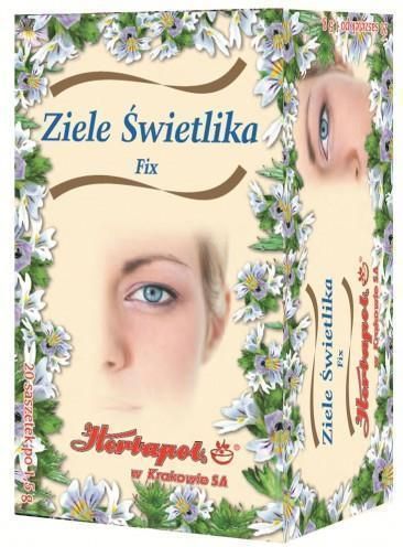 Ziele Świetlika, herbatka fix wspomaga łagodzenie podrażnień oka, odżywienie, regenerację gałki ocznej. Ziele Świetlika, herbatka fix – składniki aktywne Euphrasia officinalis. Ziele Świetlika, herbatka fix – sposób użycia 1 saszetkę ziela świetlika zalać szklanką wrzącej wody, pozostawić pod przykryciem 5 minut i odstawić do ostygnięcia. Ziele Świetlika, herbatka fix – dodatkowe informacje suplement diety pod postacią torebek z herbatą, 20 sztuk w opakowaniu, suplement diety nie jest lekiem i nie może być stosowany jako substytut zróżnicowanej diety. Co warto wiedzieć o suplemencie diety Ziele Świetlika, herbatka fix? Lecznicze właściwości ziela świetlika są znane od dawna, jest to zioło stosowane szeroko w medycynie ludowej. Ziele Świetlika, herbatka fix (20 x 1,5 g) doskonale sprawdzi się do stosowania jako okłady na oczy w przypadku ich ogólnego zmęczenia. Działa odżywczo, odprężająco i łagodzi podrażnienia. Ziele Świetlika, herbatka fix Herbapol znajduje zastosowanie w stanach zapalnych spojówek różnego pochodzenia. Pomaga również w leczeniu jęczmienia na powiekach. Preparat polecany jest również przy łzawieniu spowodowanym reakcjami alergicznymi. Można stosować tę herbatkę codziennie, by zapewnić oczom odpoczynek. Ziele Świetlika, herbatka fix (20 x 1,5 g) redukuje ich zmęczenie i zaczerwienienie. Regeneruje gałkę oczną. Co ważne, chroni również oko przed działaniem promieni UV, a także światła pochodzącego z ekranów monitorów, na które w dzisiejszych czasach wszyscy jesteśmy bardzo narażeni.
