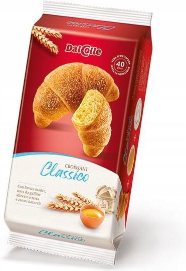 Rogaliki klasyczne 40g x 5szt 200g Poznaj wyjątkowe rogaliki prosto z Włoch – Dal Colle Croissant Classico to połączenie delikatnego ciasta francuskiego z tradycyjnym smakiem, idealne na śniadanie, deser czy słodką przekąskę w ciągu dnia. Autentyczny włoski smak – wypiekane na naturalnym zakwasie, z dodatkiem jaj z chowu ściółkowego i masła, co nadaje im wyjątkową puszystość i aromat. Bez nadzienia – idealne dla miłośników klasycznych wypieków lub jako baza do własnych dodatków, takich jak dżem, miód czy krem czekoladowy. Klasyczna włoska przyjemność w każdej warstwie! Indywidualne pakowanie – 5 rogalików po 40 g, każdy zapakowany osobno, co gwarantuje świeżość i wygodę spożycia w dowolnym miejscu i czasie. Idealne na każdą okazję – doskonałe jako dodatek do porannej kawy, element śniadaniówki czy słodka niespodzianka w ciągu dnia. Składniki mąka PSZENNA 40,6 %, margaryna roślinna (tłuszcz palmowy, olej słonecznikowy, woda, emulgatory: mono- i diglicerydy kwasów tłuszczowych, sól, regulator kwasowości: kwas cytrynowy), JAJA z chowu ściółkowego 10,5 %, cukier, woda, emulgatory: mono- i diglicerydy kwasów tłuszczowych, cukier granulowany 4 %, syrop glukozowy, drożdże naturalne 2,4 % (zawiera PSZENICĘ), masło (MLEKO), sól, glazura (woda, białka roślinne, olej słonecznikowy, dekstroza, maltodekstryna, skrobia), odtłuszczone MLEKO w proszku, naturalne aromaty. Może zawierać ORZESZKI ARACHIDOWE, ORZECHY, GORCZYCĘ, SOJĘ i SEZAM.