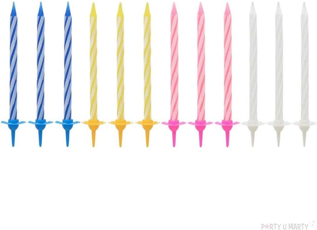 ŚWIECZKI URODZINOWE, KOLOROWE, 24 SZT. Wysokość: 6 cm Wzór: paski Kolor: niebieski, żółty, różowy, biały (po 6 szt. z koloru) Ilość: 24 szt. świeczek + 12 szt. podstawek Producent: Godan S.A. Uwaga - oferta zawiera 1 opakowanie świeczek (24 sztuki). W przypadku zakupu opakowania zbiorczego (24 opakowania po 24 szt) karton zbiorczy ma postać tzw. display'a sklepowego.