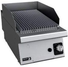 Opis urządzenia: Laserowo cięte krawędzie, automatycznie spawane i polerowane. Niewidoczne śruby łączące. Żeliwne grille demontowane bez potrzeby użycia narzędzi w postaci 170-milimetrowych odcinków. Ruszty żeliwne są dwustronne, z różnymi wykończeniem po każdej stronie: pochylony i ryflowany z grzbietami na mięso poziomy i płaski do ryb i warzyw. Grill osiąga bardzo wysoką temperaturę (400°C), co oznacza, że powierzchnia grillowanego produktu gwałtownie się zasklepia, zapewniając większą soczystość dania. W modelu ze stali nierdzewnej ruszt jest wykonany z blach AISI-304 w kształcie „V” w celu ułatwienia czyszczenia. Posiada otwór do pojemnika do zbierania tłuszczu o pojemności do 12 litrów (jeden zbiornik w urządzeniach z połową modułu, dwa zbiorniki w urządzeniach z pełnym modułem). Tace do gromadzenia tłuszczu oferują możliwość nalewania do nich wody, co dzięki naświetlaniu cieplnemu palników gazowych lub elektrycznych elementów grzewczych wytwarzana jest para, dzięki czemu żywność można grillować przy jej użyciu. Grill wyposażony w demontowana osłonę przeciwrozbryzgową o wysokości 130 mm, wykonaną ze stali nierdzewnej. Wysokotemperaturowy, emaliowany, żeliwny ochraniacz przewodu kominowego. Serwisowy dostęp do komponentów od frontu. Urządzenia ze stopniem ochrony przed wodą IPX5. Grupy palników rurowych (grupa dwóch elementów dla modeli o połowie rozmiaru, dwie grupy dla modeli z pojedynczym modułem). Niezależna kontrola dla każdej grupy palników w znaczeniu zaworu bezpieczeństwa z termoelementem. Palniki włączane za pomocą zapłonu piezoelektrycznego. Palniki podgrzewające kamienie ceramiczne umieszczone na podstawie, dzięki czemu możliwe jest podgrzewanie potraw na grillu. Akcesoria w zestawie: Specjalny skrobak z dwoma profilami Parametry techniczne: Typ rusztu: żeliwo Strefy: 1 Ilość rusztów: 2 Rozmiar rusztu: 340x690 mm Powierzchnia rusztu: 24 dm2 Moc całkowita: 11 kW Wymiary: 400x930x290 mm