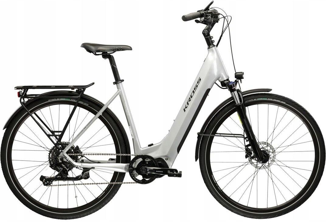 Elektryczny rower trekkingowy KROSS TRANS HYBRID 5.0 LS rozmiar XL Srebrny Rowery trekkingowe Kross to doskonałe jednoślady do odkrywania nowych tras i podbijania różnorodnych terenów. Wyposażone w stabilne ramy, precyzyjne przerzutki oraz ergonomiczne kierownice, rowery trekkingowe Kross gwarantują nie tylko wygodę na długich trasach, ale także pełną kontrolę i niezawodność w różnych warunkach. KROSS TRANS HYBRID LS 5.0 Czerpanie przyjemności z jazdy jeszcze nigdy nie było tak komfortowe. KROSS Trans Hybrid LS 5.0 to elektryczny rower trekkingowy, który dzięki zastosowanemu wysokiej jakości napędowi umożliwi Ci szybkie przemieszczanie się po mieście, a wygodna geometria połączona z amortyzowanym widelcem pozwolą na przyjemną jazdę nawet po najgorszych ścieżkach rowerowych. Siła elektrycznego wspomagania Żeby zapewnić Ci komfortową jazdę w każdych warunkach, KROSS Trans Hybrid LS 5.0 został wyposażony w zamontowany centralnie napęd elektryczny Shimano. Uzupełnia go wydajna bateria o pojemności 630 Wh, dzięki której pokonanie wielu kilometrów bez ładowania nie będzie stanowiło żadnego wyzwania.W zestawie znajduje się także wyświetlacz Shimano, pozwalający na odczyt najważniejszych informacji związanych z jazdą. Dowiesz się z niego w jakim trybie pracuje aktualnie silnik, o stopniu naładowania baterii, czy też z jaką prędkością obecnie jedziesz. Osprzęt do lekkiego terenu i miejskiej jazdy KROSS Trans Hybrid LS 5.0 stworzyliśmy z myślą o tym, by sprawiał Ci przyjemność z pokonywania każdego kilometra trasy. Sprawdzony napęd Microshift z 9 przełożeniami zapewnia komfortową jazdę w każdym terenie. Tylna przerzutka z grupy Advent to trwała i sprawdzona konstrukcja, która zapewnia płynną i responsywną zmianę przełożeń niezależnie od warunków na trasie.By zapewnić pewność hamowania w każdych warunkach zamontowane zostały hydrauliczne hamulce tarczowe Shimano. Zapewniają one dużą większą siłę hamowania niż klasyczne hamulce v-brake. To także dużo większa i precyzyjniejsza modulacja siły hamowania niż w przypadku mechanicznych hamulców tarczowych. Idealny do codziennego użytkowania Zintegrowane z rowerem oświetlenie ułatwi jazdę po zmroku, a wysokiej jakości siodełko zachwyci Cię komfortem, jaki zaoferuje Ci podczas pokonywania długich tras.W rowerze trekkingowym nie mogło zabraknąć solidnego i stabilnego bagażnika. Umożliwia on przewożenie niezbędnego ekwipunku, a także nie będzie problemem montaż na nim dodatkowych sakw. Do kompletu trafił również system pełnych błotników, który zapewnia doskonałą ochronę przed błotem. Technologie wspierające Cię w Twoich podróżach rowerowych Rama KROSS Trans Hybrid LS 5.0 została wykonana z aluminium 6061. Ten specjalny stop aluminium sprawia, że rower jest sztywny i odporny na złamania. Jednocześnie, jest to stosunkowo lekki materiał, który może zaskoczyć niejednego rowerzystę swoimi właściwościami. Rama jest malowana proszkowo, co przekłada się na trwałość malowania oraz odporność lakieru na uszkodzenia mechaniczne.Przy projektowaniu ramy postanowiliśmy wyposażyć ją w wewnętrzne prowadzenie linek. Dzięki temu sprawiliśmy, że rower wygląda estetycznie i schludnie, przez co może stanowić doskonały środek dojazdowy do pracy dla wielu osób. Ten system prowadzenia linek pozwolił nam także na zmniejszenie ryzyka zerwania linki w trakcie jazdy w terenie.Amortyzowany widelec SR Suntour ze skokiem 63 mm sprawi, że bez problemu dojedziesz do miejsca docelowego bez martwienia się o krawężniki czy kostkę brukową. W lesie natomiast możliwa będzie jazda bez obaw o kamienie czy korzenie. Blokada znajdująca się w koronie widelca umożliwi łatwiejsze oraz skuteczniejsze pokonywanie płaskich odcinków trasy. Do roweru elektrycznego sugerujemy zakup licznika przewodowego. Napęd elektryczny jest zgodny z przepisami Prawa o ruchu drogowym, a maksymalna prędkość wspomagania to 25 km/h. Rama i widelec · Materiał ramy aluminium performance · Widelec sr suntour nex e25 · Skok widelca 63mm · Tylny amortyzator brak · Skok tylnego amortyzatora brak · Wykończenie lakieru połysk · Kolor ramy srebrny Napęd · Przerzutka przód brak · Przerzutka tył microshift advent m619 · Manetki microshift advent · Korba shimano steps e5010 · Koronki 38t/170mm · Kaseta / wolnobieg microshift h093 · Zakres kasety/wolnobiegu 11-42t · Ilość przełożeń 9 · Suport brak · Łańcuch ybn s9e Koła · Piasta przód aluminium · Piasta tył aluminium · Obręcze aluminium · Opony schwalbe road cruiser 28x1,75 Hamulce · Hamulec przód shimano mt200 · Hamulec tył shimano mt200 · Dźwignie hamulca shimano mt200 · Tarcze hamulcowe 160 · Tarcze hamulcowe tył 160 Komponenty · Kierownica aluminium 660 mm 31.8 · Wspornik kierownicy aluminium 31,8 (m, l - 90mm; xl - 110mm) · Siodło selle royal · Wspornik siodła aluminium 31,6x350 · Stery 1-1/8"-1.5" · Chwyty hermans oxy · Pedały aluminium System e-bike · Silnik shimano e5000 · Umiejscowienie silnika centralne · Moc silnika 250w · Moment obrotowy silnika 40 nm · Bateria simplo 17,5ah/630wh · Rodzaj baterii zintegrowana · Umiejscowienie baterii zintegrowana · Pojemność znamionowa baterii ah/wh 17,5 ah / 630 wh · Napięcie znamionowe 36 v · Ładowarka 42 v / 4 a · Czas ładowania do 100% (h) 4,5 · Zasięg [km] · Do 120 · Tryby wspomagania off, eco, normal, high · Walk-assist tak · Wyświetlacz shimano sc-e6100c · Maksymalna prędkość wspomagania 25 km/h