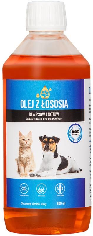 Olej z łososia 100% 500 ml Poprawa kondycji skóry – kwasy omega-3 i omega-6 wpływają korzystnie na stan skóry Ochrona stawów – kwasy tłuszczowe poprawiają ich ruchomość i elastyczność Działanie przeciwzapalne - kwasy DHA i EPA mają właściwości przeciwzapalne Lab-v Salmon Oil to klucz do zdrowia i dobrego samopoczucia Twojego czworonoga. Olej z łososia stanowi naturalne źródło nienasyconych kwasów tłuszczowych omega-3 i omega-6, które są niezbędne w diecie zwierząt i przyczyniają się do zdrowego wyglądu ich skóry i sierści. Olej z łososia wspiera optymalne trawienie, a jego nienasycone kwasy tłuszczowe, mające działanie przeciwzapalne, wspomagają prawidłowe funkcjonowanie układu pokarmowego i wzbogacają karmę o wartościowe składniki. Dlaczego warto wprowadzić Lab-v Salmon Oil do diety psa lub kota? Suplementacja olejem z łososia atlantyckiego jest polecana na każdym etapie życia – zawarte w nim kwasy tłuszczowe omega-3 i omega-6 wspierają rozwój neurologiczny szczeniąt i kociąt oraz poprawiają funkcje poznawcze u starszych zwierząt. Ponadto, olej ten obniża poziom cholesterolu, zwiększa produkcję kolagenu, wspomaga organizm w walce z chorobami serca i nerek, chroni stawy przed niewydolnością i zapobiega nowotworom. Co więcej, jego smak i aromat są uwielbiane przez psy i koty. Jest idealny do stosowania w przypadku Wsparcia zdrowia stawów i kości Poprawy kondycji serca i układu krążenia Poprawa kondycji skóry i sierści Wzmocnienia układu immunologicznego Wsparcia funkcji mózgu i układu nerwowego Przeznaczenie Wsparcie dla skóry i sierści: Nienasycone kwasy tłuszczowe omega-3 i omega-6 pomagają w utrzymaniu zdrowej skóry i lśniącej sierści, co jest szczególnie ważne dla zwierząt z problemami dermatologicznymi. Działanie przeciwzapalne: Kwasy DHA i EPA mają właściwości przeciwzapalne, co wspomaga zdrowie stawów i może łagodzić objawy alergii. Wsparcie układu immunologicznego: Olej z łososia wspiera układ odpornościowy, pomagając organizmowi skuteczniej walczyć z infekcjami i chorobami. Rozwój umysłowy: Wspiera rozwój umysłowy szczeniąt i kociąt oraz procesy poznawcze u starszych pupili. Sposób użycia Idealna ilość oleju zależy od wagi Twojego psa lub kota. Zaleca się rozpocząć od połowy zalecanej dawki przez pierwsze trzy dni, a następnie dostosować ilość do potrzeb zwierzęcia. Stopniowo wprowadzaj olej do diety, aby zwierzę mogło się przyzwyczaić do nowego smaku. Podawanie Psy: 3 ml (łyżeczka) na każde 4 kilogramy masy ciała, Koty: 3 ml (łyżeczka) na każde 6 kilogramów masy ciała. Przechowywanie Olej powinien być przechowywany w ciemnym i chłodnym miejscu. Po otwarciu najlepiej trzymać go w lodówce i zużyć w ciągu 60 dni. Składniki: 100% olej z łososia atlantyckiego Kwasy tłuszczowe Omega-3: 13,84% w tym: EPA (kwas eikozapentaenowy): 3,06%, DHA (kwas dokozaheksaenowy): 4,48%, Omega-6: 13,2%. Skład analityczny Białko surowe 0% Tłuszcz surowy 99.9%, Popiół surowy 0%, Surowe włókno 0%.