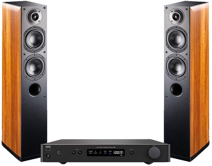 NAD - jedyna wada, że sam się nie usypia. Brak korekcji dźwięku co może przeszkadzać. Generalnie świetny sprzęt za tę cenę. Kolumny (kolor zupełnie inny niż na zdjęciach, dużo ciemniejszy) grają świetnie wysoko i średnio. Gorzej z niskimi, niemal nieodczuwalny bas co skłoniło do dołożenia subwoofera, który doskonale uzupełnia minimalne braki niskich tonów. Z czystym sumieniem mogę polecić. 4,5 na 5