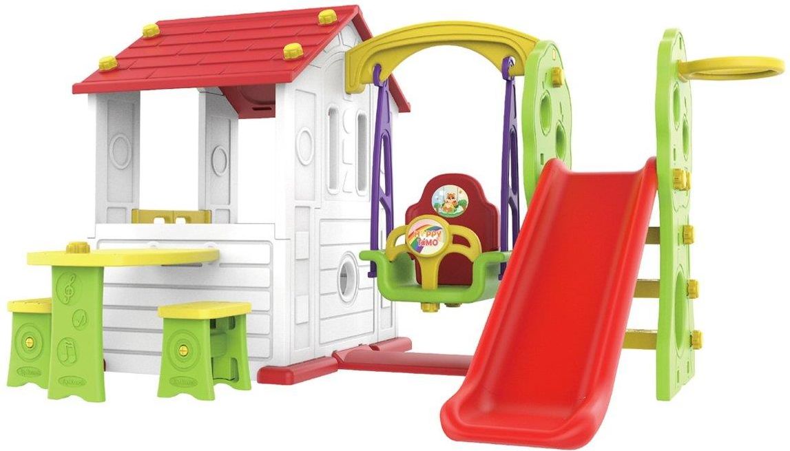 Domek ogrodowy 5w1 dla dzieci Czerwony dach ZOG.CHD-533 Specyfikacja Domek ogrodowy 5w1 Wszystkie elementy domku wykonane są z wysokiej jakości materiału HDPE. Jest to polietylen o dużej gęstości, wynoszącej od 0,942 do 0,965 g/cm3. HDPE jest materiałem bardziej elastycznym i odpornym na uszkodzenia mechaniczne w porównaniu z materiałami wykorzystywanymi w innych tego typu konstrukcjach. Wszystkie ścianki jak i elementy składowe wykonane są z podwójnej warstwy plastiku. Daje to dodatkowo możliwość wypełnienia ścianek wkładem typu piasek, kruszywo zapewniając stabilność konstrukcji. Duże elementy składowe ułatwiają montaż. Opis duża przestrzeń wewnątrz domku zapewniająca swobodę zabawy, duże otwierane na oścież drzwiczki, bezpieczna dwuwarstwowa zjeżdżalnia, szerokie wytrzymałe stopnie zjeżdżalni, wbudowana dwuwarstwowa zjeżdżalnia, Koszykówka, konstrukcja pozwala na demontaż ogródka i dobudowanie ścianki domku. Wymiary wysokość domku 128,5 cm, długość całkowita 238 cm, szerokość domku 100,4 cm, szerokość ze zjeżdżalnią 188,5 cm, rozmiary ślizgu zjeżdżalni 136 x 37,5 cm, wysokość płotka 50 cm, rozmiar okien 80 cm, rozmiary wejścia 45,8 cm, waga domku 35 kg, wymiary opakowania 137x69x48 waga 38kg