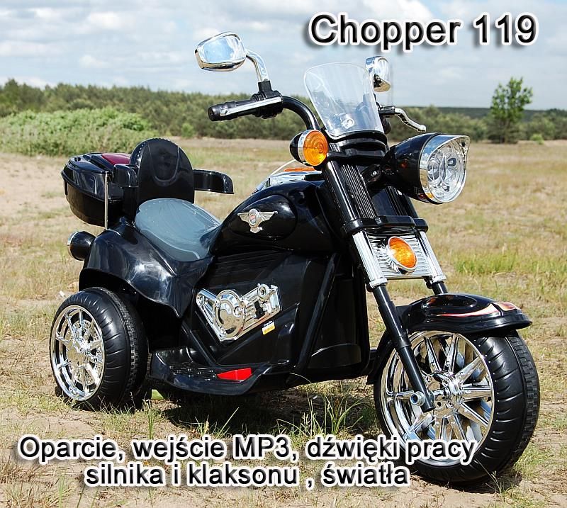 Absolutna nowość !!!!!! Motor CHOPPER C119 - najmocniejsza wersja pojazdu z wspaniałym wyposażeniem. Napędzany silnikiem 25 W, model z oparciem. Motor wykonany jest bardzo ładnie. Opis przedmiotu: Model w kolorze czarnym: Kuferek, oparcie i wygodne siedzenie. Przód motorka: Efektowne lusterka, …