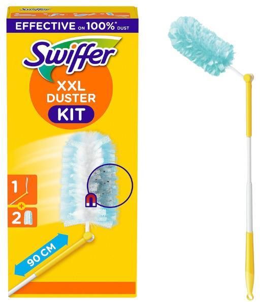 Swiffer Duster Kit miotełka do usuwania kurzu 1 rączka + 2 miotełki Miotełka Swiffer Duster w zestawie to praktyczne narzędzie do szybkiego usuwania kurzu i sierści z mebli, sprzętu RTV czy wnętrza auta. Elastyczne włókna 360° dopasowują się do kształtów i szczelin, ułatwiając codzienną pielęgnację przestrzeni. Teleskopowy uchwyt sięga do 90 cm, a głowica z blokadą w 4 pozycjach pomaga czyścić pod kątem listwy, żaluzje i górne półki. Zestaw startowy obejmuje rączkę oraz 2 wkłady, które działają na większości suchych powierzchni. Najważniejsze cechy Włókna 360° przyciągają i zatrzymują kurz oraz sierść. Teleskopowy uchwyt do 90 cm do wysokich i niskich miejsc. Ruchoma głowica z 4 ustawieniami do czyszczenia pod kątem. Zestaw startowy: 1 rączka + 2 wkłady. Delikatna dla powierzchni, nie pozostawia kłaczków. Sposób użycia: roztrzep wkład, nałóż na rączkę i omiataj suche powierzchnie; wymień wkład, gdy będzie pełny.