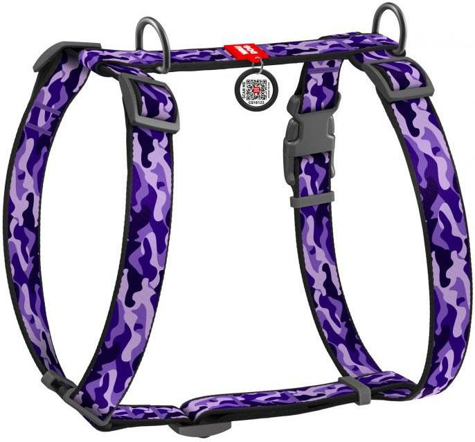 Regulowana uprząż dla psa firmy WauDog w kolorze Purple Camo. Wykonana została z lekkiego i wytrzymałego nylonu. Zapinana jest za pomocą klamry zatrzaskowej typu fastex z zamkiem, który uniemożliwia samoistne rozpięcie.