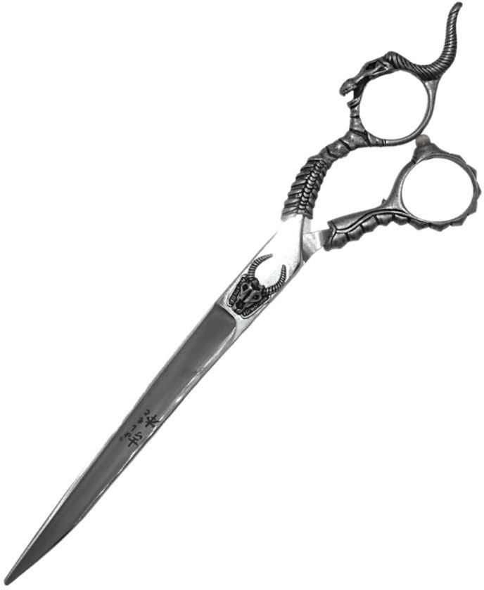 Profesjonalne proste nożyczki fryzjerskie z ostrzem typu Convex. Wykonane są z wysokiej jakości, powlekanej stali nierdzewnej 440C o wysokiej twardości. Nożyczki z podpórką na palce. Posiadają śrubę dociskową. Niepowtarzalne elementy ozodobne na nożyczkach podkreślają mistycyzm fryzjera. rozmiar 8" długość całkowita 22,0 cm z hakiem długość części roboczej 11.5 cm