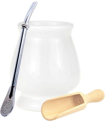 Zestaw startowy akcesoriów do Yerba Mate Zestaw zawiera: Matero Ceramiczne Yerba Mate biały kielich 200ml Bombilla nierdzewna z pierścieniem chłodzącym Drewniana nabierka do Yerba Mate 1.Matero Ceramiczne do Yerba Mate biały kielich 200ml Profesjonalnie ręcznie wykonane naczynko z ceramiki …
