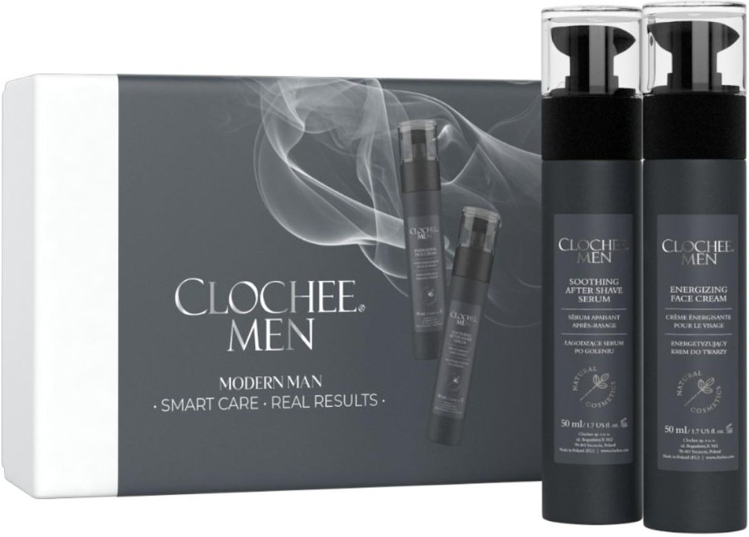 Clochee Men Zestaw: nawilżający krem do twarzy + łagodzące serum po goleniuZestaw Clochee dla mężczyzn to połączenie intensywnego nawilżenia, ochrony i regeneracji w lekkich, komfortowych formułach stworzonych z myślą o codziennej pielęgnacji męskiej skóry. Działa kompleksowo — odświeża, energetyzuje i koi skórę, jednocześnie dbając o jej naturalną barierę ochronną. To idealny duet dla mężczyzn, którzy cenią skuteczność, szybkość działania i uczucie komfortu przez cały dzień. W zestawie znajdują