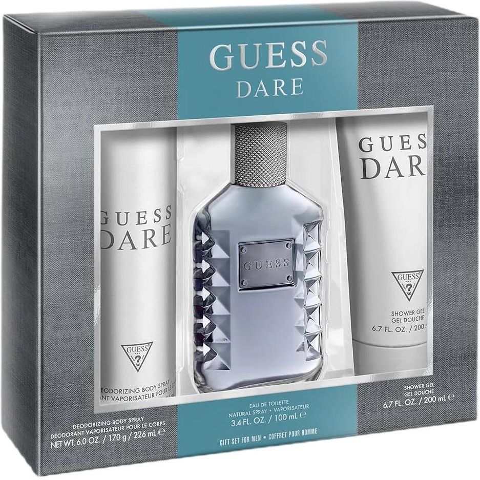 Podaruj mu prezent, który go zachwyci – GUESS Dare for Men. Wyjątkowy zapach, w którym nuty bergamotki, geranium i piżma tworzą niezapomnianą kompozycję, pełną męskiego uroku i pasji do przygód. W skład zestawu wchodzi woda toaletowa o pojemności 100ml, żel pod prysznic o pojemności 200ml oraz dezodorant w sprayu o pojemności 226ml. Nuty zapachowe: Nuta głowy: bergamotka, biały pieprz, jagody jałowca Nuta serca: geranium, drzewo kaszmirowe, jaśmin Nuta bazy: piżmo, paczula, cedr