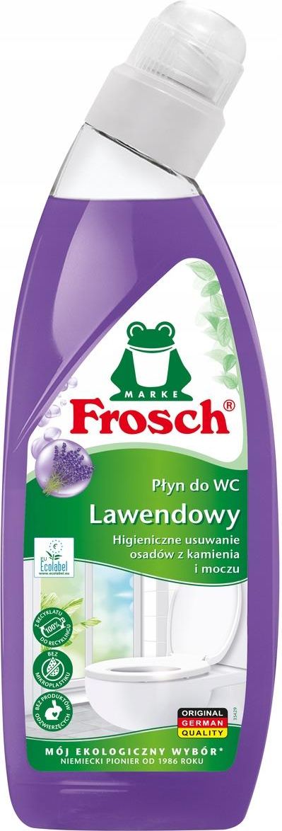 Frosch Lawendowy Koncentrat Do Czyszczenia WC 750Ml Frosch Lawendowy Koncentrat Do Czyszczenia WC to wyjątkowy produkt, który zapewni Twojej łazience nieskazitelną czystość i świeżość. Dzięki swojemu ekologicznemu składowi oraz skuteczności, jest idealnym wyborem dla osób dbających o środowisko i szukających niezawodnych środków czystości. Wszechstronne zastosowanie Produkt Frosch to preparat do czyszczenia kuchni i łazienki, specjalnie zaprojektowany do usuwania kamienia i innych zanieczyszczeń z muszli WC. Jego skuteczność sprawia, że jest idealny do codziennego użytku w łazience, zapewniając higieniczne czyszczenie i usuwanie uporczywych plam. Efekty działania Dzięki temu koncentratowi Frosch Twoja łazienka będzie lśnić czystością. Oto kilka efektów działania produktu: usuwa kamień, ślady moczu i brud, czyści także pod krawędzią muszli, dogłębnie usuwa nieprzyjemną woń, pozostawia świeży, lawendowy zapach, zapewnia higieniczne czyszczenie dzięki mocy lawendy. Skład produktu i ekologiczność Kolejnym atutem Frosch Lawendowy Koncentrat Do Czyszczenia WC jest jego ekologiczny skład. Produkt zawiera poniższe składniki: kompozycje zapachowe, olejek lawendowy, barwniki kosmetyczne. Dzięki zastosowaniu szybko biodegradowalnych substancji pochodzenia roślinnego, produkt jest przyjazny dla środowiska. Co więcej, marka Frosch w 100% stosuje tworzywo sztuczne pochodzące z recyklingu, a ich produkty posiadają certyfikat ekologiczny (EMAS III). Niemiecka jakość i tradycja ekologii Frosch, marka będąca pionierem w dziedzinie ekologii od 1986 roku, oferuje produkty oparte na roślinnych substancjach myjących, które są skuteczne i bezpieczne dla użytkowników oraz środowiska. Firma konsekwentnie unika agresywnych składników takich jak fosforany, co dodatkowo podkreśla ich zaangażowanie w ochronę przyrody. Sposób użycia i bezpieczeństwo Korzystanie z koncentratu Frosch jest niezwykle proste: Ściśnij zakrętkę z zabezpieczeniem i odkręć ją. Spryskaj muszlę i powierzchnię pod krawędzią. Odczekaj chwilę, w razie potrzeby doczyść szczotką i następnie spłucz. Pamiętaj, aby przechowywać produkt poza zasięgiem dzieci oraz nie mieszać go z innymi środkami czystości. Produkt nie jest przeznaczony do czyszczenia dużych powierzchni oraz marmuru lub innych wrażliwych na kwasy materiałów. Podsumowanie Frosch Lawendowy Koncentrat Do Czyszczenia WC 750Ml to doskonały wybór dla każdego, kto szuka skutecznego i ekologicznego środka do czyszczenia łazienki. Dzięki swoim właściwościom usuwa kamień i inne zanieczyszczenia, pozostawiając świeży lawendowy zapach oraz nieskazitelną czystość. Jego ekologiczny skład oraz opakowanie wykonane w 100% z recyklingu sprawiają, że jest bezpieczny zarówno dla użytkowników jak i środowiska.