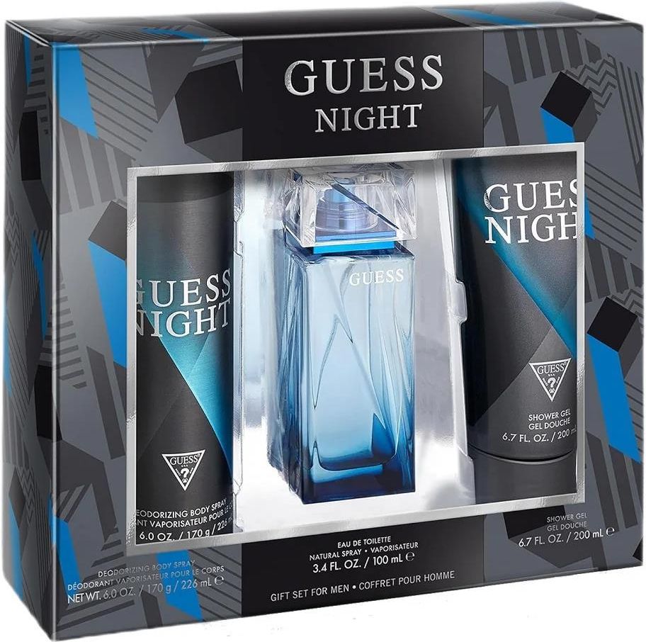 Guess Night Men Zestaw EDT, 100 ml + Żel, 200 ml + Dezodorant, 226 ml Odkryj esencję tajemnicy z zapachem GUESS NIGHT. Ten intrygujący aromat ucieleśnia wyjątkowy magnetyzm i przyciągający styl, z którego słynie marka GUESS. Poczuj zmysłową energię unoszącą się w powietrzu dzięki zestawowi GUESS Night, zawierającemu wodę toaletową (100 ml), żel pod prysznic (200 ml) oraz dezodorant w sprayu (226 ml). Night to drzewna kompozycja zapachowa stworzona dla mężczyzn. Zapach został wydany w 2013 roku. Za stworzeniem tego zapachu stoi duet perfumiarzy: Antoine Lie i Francis Kurkdjian. Nuty zapachowe Nuta głowy: żywica elemi, pieprz, grejpfrut Nuta serca: wetyweria, geranium, cedr Nuta bazy: paczula, labdanum, koktajl black vanilla husk
