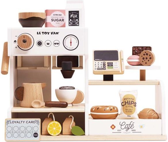 Realistyczna drewniana kawiarnia jest wyposażona we wszystko co potrzebne, aby poczuć się prawdziwym baristą lub lojalnym klientem! W zestawie znajdują się: profesjonalna maszyna do kawy z młynkiem na kawę ziarnistą, wyjmowanym filtrem i spieniaczem mleka, dwustronne kapsułki kawowe, które po jednej stronie mają ziarna kawy, a po drugiej wzorki do umieszczenia na napojach. Jest również lada, stojak na ciasto, kasa, tablica z menu, a nawet karta lojalnościowa do stemplowania dla stałych klientów! Zabawka ma aż 18 drewnianych elementów i pomaga rozwijać umiejętności społeczne, mowę i zdolność czekania podczas zabawy. To imponujące stoisko jest zabawką wysokiej jakości, zostało wykonane z solidnego drewna certyfikowanego przez FSC® i pomalowane przy użyciu bezpiecznych dla dzieci farb na bazie wody. Kawiarnia stanowi wyjątkowy i przemyślany prezent na każdą uroczystość. Poznaj akcesoria dla małych sprzedawców i klientów z oferty marki Le Toy Van sprzedawanych oddzielnie. Wyszukane wzornictwo i staranne wykonanie zapraszają Twoje dziecko do eksperymentowania, kreatywnej zabawy, odgrywania ról i tworzenia zupełnie nowych historii. Wszystkie zabawki Le Toy Van są tworzone, aby przetrwać lata. Zostały starannie zaprojektowane i wykonane przez wykwalifikowanych rzemieślników z wykorzystaniem etycznych praktyk i zrównoważonych materiałów. Specyfikacja: Przeznaczone dla dzieci w wieku od 3 lat Wymiary: Szerokość: 40.7 cm x Głębokość: 15 cm x Wysokość: 31.5 cm Trwałe drewno pozyskiwane ze zrównoważonych źródeł FSC® Surowo przetestowane, aby spełniać najwyższe standardy bezpieczeństwa Udekorowane przy użyciu farb na bazie wody, nietoksycznych O marce Le Toy Van Misją brytyjskiej marki Le Toy Van jest tworzenie przepełnionych miłością, wyjątkowo pięknych zabawek, które przetrwają próbę czasu i dają naszym pociechom niezrównaną frajdę z zabawy. Zabawki Le Toy Van są wyjątkowe - wytwarzane z drewna i materiałów wyłącznie o zrównoważonym pochodzeniu, wykonane w zgodzie z najsurowszymi standardami europejskimi i amerykańskimi bezpieczeństwa dla dzieci. Marka sprzedaje swoje zabawki na całym świecie, a utalentowany zespół projektantów tworzy je i opracowuje w Wielkiej Brytanii. Firma współpracuje tylko z wykonawcami, którym przyświecają te same ideały i wciąż podnosi poprzeczkę w kwestiach jakości zabawek i standardów ich wykonania. Le Toy Van to marka wielokrotnie nagradzana za jakość, design, bezpieczeństwo, zaangażowanie w środowisko, a także wartość edukacyjną i atrakcyjność zabawy swoich produktów. Zabawki Le Toy Van „występują” w produkcjach wytwórni filmowej Disney, od lat zajmują zasłużone miejsce na szczytach rankingów Vogue, Forbes, GQ, New York Post, The Independent, Glamour i innych. Pomimo tak wielu nagród i wyróżnień Le Toy Van nie spoczywa na laurach i tworzy wciąż coraz lepsze zabawki, które przynoszą radość i magię zabawy dzieciom na całym świecie. Wszystkie zabawki marki Le Toy Van są zbadane w laboratoriach SGS pod kątem zgodności ze standardami ASTM, BS EN-71, EN-71, AUS i CCPSIA.