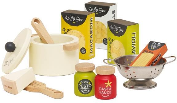 Drewniane jedzenie makarony do zabawy akcesoria kuchenne zabawka Le Toy Van Czy są tu miłośnicy włoskiej kuchni? Ten 12-elementowy zestaw zawiera niezbędne akcesoria i produkty do przygotowania doskonałego włoskiego posiłku: rondel, metalowy durszlak, tarka do sera, parmezan, drewniana łyżka, …