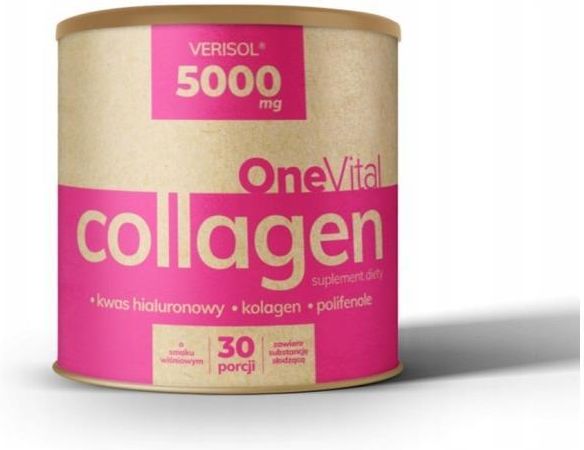 OneVital Collagen 198 g Suplement diety Smak wiśniowy Collagen OneVital to innowacyjny suplement diety stworzony z myślą o kompleksowym wsparciu zdrowia skóry, włosów i paznokci. Jego skuteczność opiera się na starannie dobranych, wysokiej jakości składnikach, które współdziałają, wspierając naturalne procesy regeneracyjne organizmu, a także poprawiając wygląd i kondycję tkanek. Ma formę funkcjonalnego napoju, który zawiera rybi kolagen w proszku, dzięki czemu jego stosowanie jest wyjątkowo wygodne – wystarczy rozpuścić go w wodzie, soku lub ulubionym koktajlu. Pyszny wiśniowy smak sprawia, że suplementacja staje się przyjemnym rytuałem. Każda porcja dostarcza 5 g hydrolizowanego kolagenu VERISOL®, który cechuje się wysoką przyswajalnością. Produkt został wzbogacony o kwas hialuronowy, zapewniający głębokie nawilżenie, witaminę C wspierającą proces syntezy kolagenu, miedź odpowiedzialną za właściwą pigmentację oraz polifenole o silnym działaniu antyoksydacyjnym. To doskonałe rozwiązanie dla osób, które chcą zadbać zarówno o swoją urodę, jak i zdrowie. Dlaczego warto wybrać kolagen VERISOL®? VERISOL® to nowoczesny rodzaj bioaktywnych peptydów kolagenowych, stworzony w oparciu o zaawansowane technologie. Jego wyjątkowa skuteczność i jakość zostały potwierdzone badaniami klinicznymi, co czyni go jednym z najlepszych dostępnych opcji w swojej kategorii. Skuteczność potwierdzona badaniami Kliniczne testy nad kolagenem rybim VERISOL® wykazały, że jego regularne stosowanie poprawia elastyczność skóry, redukuje widoczność zmarszczek i wspiera procesy regeneracyjne tkanek. Wyjątkowa biodostępność Dzięki swojej niskiej masie cząsteczkowej VERISOL® jest łatwo wchłaniany przez organizm. Po dotarciu do fibroblastów skóry stymuluje komórki do zwiększenia produkcji składników macierzy pozakomórkowej, takich jak kolagen, elastyna, proteoglikany czy kwas hialuronowy. Stosowanie go powoduje widoczne efekty, takie jak wygładzenie zmarszczek, poprawa jędrności skóry, wzmocnienie paznokci i zwiększenie objętości włosów. Suplementacja wspierająca urodę VERISOL® działa kompleksowo, wspierając kondycję skóry, włosów i paznokci. Badania pokazują, że już po kilku tygodniach regularnego stosowania zauważalne są pierwsze efekty – skóra staje się bardziej elastyczna, zmarszczki mniej widoczne, a paznokcie wyraźnie wzmocnione i mniej podatne na łamanie. Collagen OneVital to wybór, który pozwala kompleksowo zadbać o piękno i zdrowie, zapewniając organizmowi wszystko, co niezbędne, by wyglądać i czuć się świetnie. Efekty stosowania miedź - pomaga w utrzymaniu prawidłowej pigmentacji włosów, pomaga w utrzymaniu prawidłowej pigmentacji skóry, pomaga w ochronie komórek przed stresem oksydacyjnym, pomaga w utrzymaniu prawidłowego stanu tkanek łącznych witamina C - pomaga w prawidłowej produkcji kolagenu w celu zapewnienia prawidłowego funkcjonowania naczyń krwionośnych, pomaga w prawidłowej produkcji kolagenu w celu zapewnienia prawidłowego funkcjonowania skóry, pomaga w ochronie komórek przed stresem oksydacyjnym. Stosowanie Porcję produktu (1 miarka- 6,6 g) rozpuścić w 200 ml wody. Nie należy przekraczać zalecanej dziennej porcji. Suplement diety nie może być stosowany jako substytut (zamiennik) zróżnicowanej diety. Zróżnicowany sposób żywienia i zdrowy tryb życia są ważne. Jedno opakowanie wystarcza na 30 dni suplementacji. Składniki VERISOL®- hydrolizat kolagenu rybiego, ekstrakt z dzikiej róży (Rosa canina L.), aromat naturalny wiśniowy z innymi naturalnymi aromatami, burak czerwony zagęszczony sok (proszek), regulator kwasowości (kwasek cytrynowy), kwas hialuronowy (hialuronian sodu), ekstrakt z zielonej herbaty (Camellia sinensis (L.) Kuntze), substancja słodząca (sukraloza), miedź (diglicynian miedzi). VERISOL® jest zastrzeżonym znakiem towarowym GELITA. Składniki odżywcze W porcji dziennej % RWS* w porcji dziennej (6,6g) Verisol®- hydrolizat kolagenu rybiego 5000 mg ** Ekstrakt z dzikiej róży, w tym: 600 mg - witamina C 420 mg ** 525% Kwas hialuronowy 80 mg ** Ekstrakt z zielonej herbaty, w tym: 80 mg ** -polifenole 40 mg ** Miedź 1 mg 100% *RWS: dzienna referencyjna wartość spożycia dla osób dorosłych. Referencyjna wartość spożycia dla przeciętnej osoby dorosłej (8 400 kJ/2 000 kcal). **: brak referencyjnej wartości spożycia Masa netto 198 g Suplementy diety nie mogą być stosowane jako substytut (zamiennik) zróżnicowanej diety ani zdrowego trybu życia. Nie należy przekraczać zalecanej porcji produktu do spożycia w ciągu dnia. Suplementy diety powinny być przechowywane w sposób niedostępny dla małych dzieci. Przed zastosowaniem produktu sugerujemy zapoznanie się z dokładnymi informacjami podanymi na opakowaniu lub załączonej ulotce. Warunki przechowywania Przechowywać w szczelnym opakowaniu. W suchym i chłodnym miejscu, w sposób niedostępny dla dzieci. Chronić przed światłem. Producent ONESANO S.A. Dyrekcyjna 6 41-506 Chorzów Polska