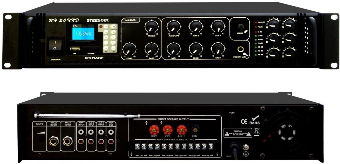 Wzmacniacz radiowęzłowy ST-2250BC/MP3+FM+IR Wzmacniacz radiowęzłowy uniwerslany znajdujący swoje zastosowanie jako zasilanie systemów nagłośnienia we wszystkich obiektach użyteczności publicznej, hotelach, restauracjach, urzędach, handlowych oraz sakralnych. Nowoczesna jednostka nagłośnieniowa z odtwarzaczem MP3 oraz tunerem FM. Duża moc wyjściowa oraz wyjście z podziałem na 6 niezależnych stref głośników pozwala na zasilanie systemów nagłaśniających duże powierzchnie. Wejścia: 3 x MIC (MIC z funkcją priorytetu), 3 x AUX, wbudowany odtwarzacz MP3 - dane z zewnętrznej pamięci USB lub karty SD. Wskaźnik poziomu sygnału wyjściowego MASTER VOLUME LED, wspólna korekcja tonów niskich i wysokich. Całość z mozliwością zdalnego sterowania. Dane techniczne: Moc wyjściowa: 250W (100V, 70V, 4-8-16 Ohm) 6 stref z indywidualną regulacją głośności Pasmo przenoszenia: od 50 Hz do 15 000 Hz zasilanie: 230V~/50Hz AC Wymiary: 480 x 88 x 390 mm Waga: 12 kg