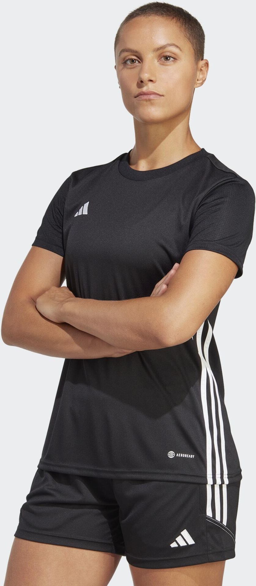 Koszulka damska adidas to jeden z najważniejszych elementów garderoby podczas treningów i decydujących rozgrywek, który pomoże zadbać o długotrwały komfort. Inspiracją do powstawia modelu był slogan „Keep it simple!”, który używany jest w piłce nożnej nie bez powodu. Niejednokrotnie jest on kluczem do spektakularnego sukcesu. Regularny krój z zaokrąglonym dekoltem o delikatnej, ściągaczowej strukturze naturalnie układa się na sylwetce zapewniając nieograniczony zakres ruchów, co w szczególności docenisz w trakcie intensywnych ćwiczeń. Koszulkę wyprodukowano z szybkoschnących włókien wspartych technologią Aeroready odpowiadającą za odprowadzenie nadmiaru wilgoci do zewnętrznych warstw w celu pozostawienia długotrwałego uczucia świeżości. Siateczkowe rękawy ułatwiają dostęp powierza, aby usprawnić proces wentylacji skóry. Poliestrowe włókna powstały w procesie recyklingu, dlatego aktywnie wspierasz walkę z zanieczyszczeniem plastikiem. Dominujący, czarny kolor będzie spójnym wykończeniem sportowej stylizacji, a wyszywane logo brandu na piersi oraz kultowe paski po bokach podnoszą unikalność całego konceptu. Z dumą prezentuj swoją wolę walki wychodząc na boisko piłkarskie w koszulce adidas. Materiał: 100% poliester z recyklingu