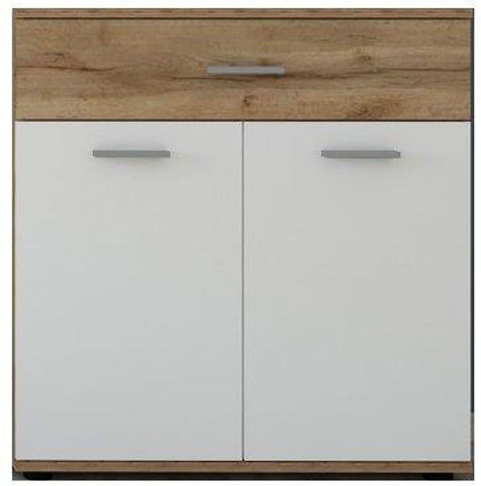 Komoda Santo Typ E 2D1S od Wipmeb łączy elegancję białych frontów z naturalnym wyglądem dąbu Wotan. Wykonana z trwałej płyty laminowanej, oferuje praktyczne rozwiązania przechowywania dzięki pojemnym szafkom i szufladzie. Idealna do nowoczesnych wnętrz.