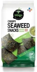 Snack Seaweed Roasted Bibigo Pyszne chrupiące przekąski doskonałej jakości, przypominające smakiem sushi. Dla dzieci i dorosłych, dla wegetarian i miłośników zdrowej żywności. Zawierają bardzo mało kalorii, ale są bardzo bogate w przydatne substancje, w szczególności jod, który jest niezbędny do prawidłowego funkcjonowania mózgu. Składniki: wodorosty (porphyra tenera) (52%), olej rzepakowy, olej sezamowy, wasabi w proszku (4%), sól.