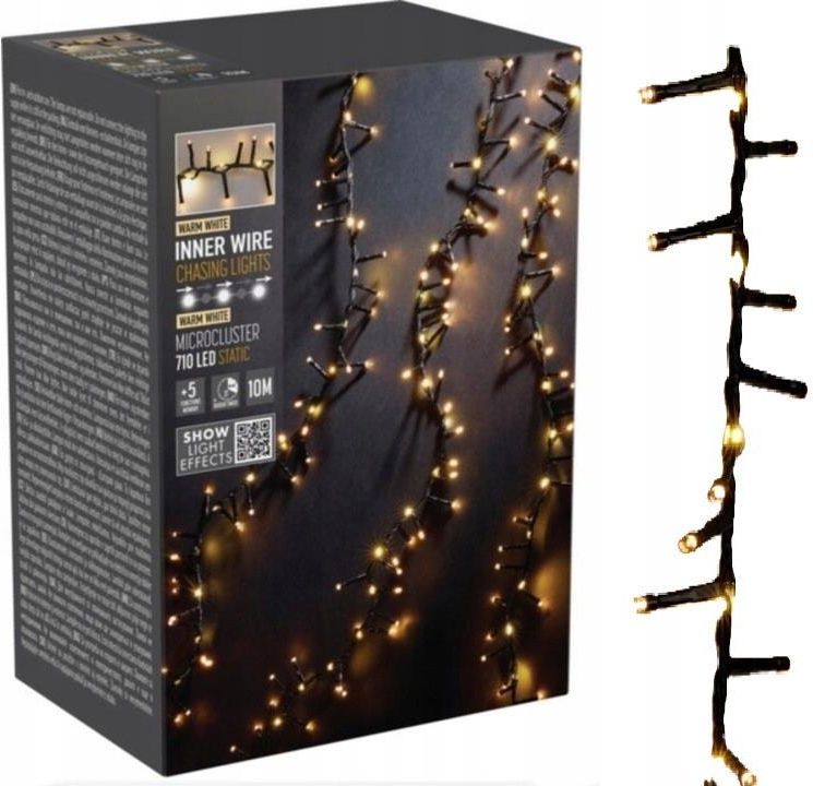 Lampki choinkowe łańcuch świetlny ciepły biały 710 LED 10m Wprowadź do domu i ogrodu miękkie, nastrojowe światło dzięki lampkom LED Snake. Aż 710 drobnych diod LED tworzy jednolitą, świetlną wstęgę w kolorze ciepłej bieli, przypominającą efekt subtelnego, świetlnego wodospadu. Elastyczny przewód typu softwire pozwala swobodnie oplatać choinki, poręcze, ramy okienne, meble czy pergole i tworzyć dekoracje, które idealnie dopasują się do każdej przestrzeni. Lampki Snake doskonale sprawdzą się jako ozdoba świąteczna, ale także jako całoroczne oświetlenie nastrojowe — do salonu, kuchni, sypialni, na taras czy do ogrodu. To dekoracja, która ociepla wnętrze, relaksuje i dodaje magii każdej chwili. Zalety Aż 710 LED – bardzo gęsta i równomierna poświata bez przerw Ciepła biel – tworzy przytulny, uspokajający klimat Długość 10 m – idealna do większych dekoracji i swobodnego modelowania Elastyczny przewód softwire – łatwe oplatanie i dopasowanie do kształtów Do wnętrz i na zewnątrz – całoroczne zastosowanie w domu i ogrodzie Efekt wodospadu – subtelnie dynamiczna ozdoba, która dodaje głębi aranżacji Energooszczędne LED – jasne światło przy niskim poborze energii Parametry Długość całkowita: ok. 10 m Liczba diod: 710 LED Kolor światła: ciepły biały Odstęp między diodami: ok. 2 cm Materiał: przewód elastyczny softwire + tworzywo LED Przeznaczenie: wnętrza i przestrzenie zewnętrzne Zasilanie: sieciowe Efekt: ciągła świetlna wstęga / efekt wodospadu